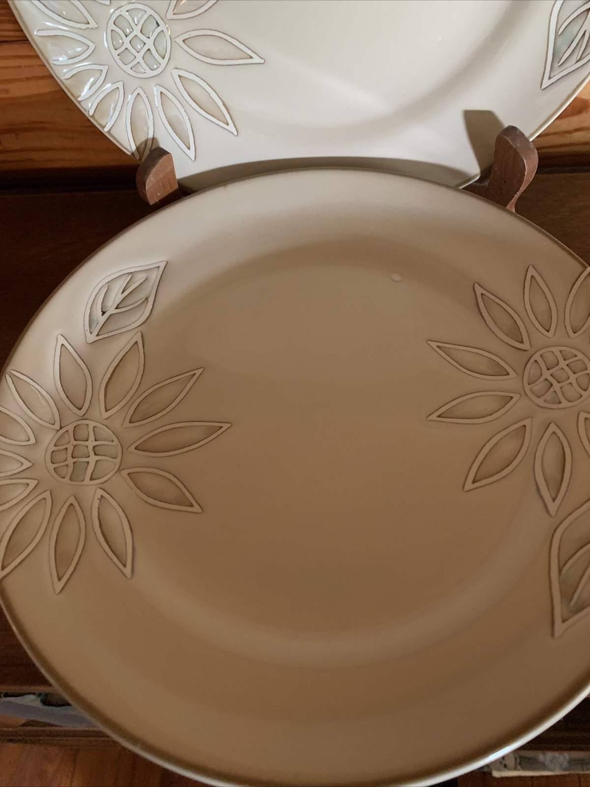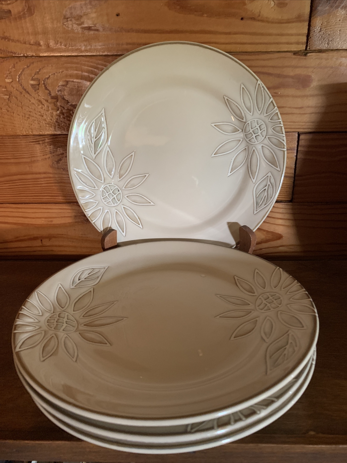 Elevate your dining experience with the Pfaltzgraff Daisy Chain Salad Plates, a set that exudes a timeless Arts & Crafts/Mission Style charm. Each plate features an embossed floral pattern, delivering a touch of elegance to your table setting. The glossy finish enhances the beige stoneware's durability and adds a lustrous appeal that is sure to complement any meal. With a plate diameter of 8.5 inches, these salad plates are the perfect size for presenting your favorite greens and desserts. Crafted in 2009, this four-piece set brings both contemporary originality and a floral theme to your dining occasions, making it a delightful addition to your dinnerware collection. Pfaltzgraff Daisy Chain Salad Plates 8.5” (Set of 4). Condition is "Used". Shipped with USPS Priority Mail. I have two sets of these with 4 salad plates in each set. The price listed is for one “set of 4”. The material is extremely substantial in weight. These are beautiful everyday dishes by Pfaltzgraff made from heavy stoneware that can go from oven to table to dishwasher without issue. The Daisy Chain pattern in neutral beige and swirled browns and creams will fit any kitchen decor. Complete your set or start a new collection today with this retired pattern produced from 2009-2013. These salad plates have no chips, cracks or crazing and show only light signs of use with regard to utensil marks or discoloration. Thank you for looking.