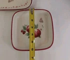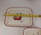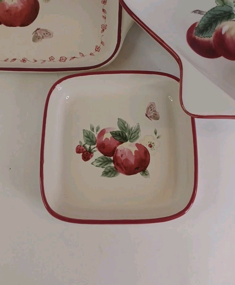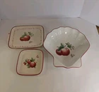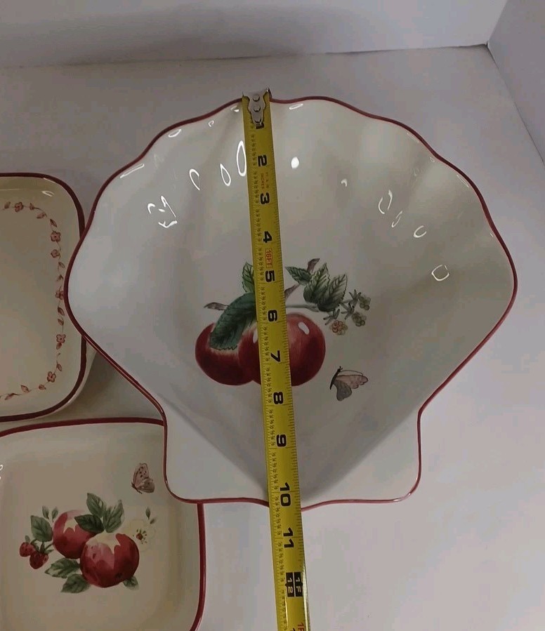 The Pfaltzgraff Delicious Apples Clam Shell Shaped Bowl, Sandwich Server, & Tray is a three-piece set made of ceramic material with a multicolor pattern of apples. The set includes a tray, bowl, and plate, all featuring an art deco style and decorated with apples. The production technique used is pottery and the set is made in China. The set weighs 2 lbs and is perfect for serving sandwiches and other dishes.