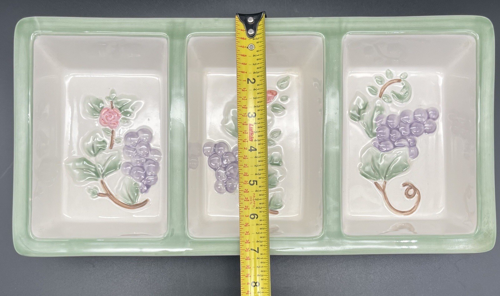 Pfaltzgraff GRAPEVINE 3 Section Serving Tray Platter ~14" X 7". A lovely piece perfect for gatherings. There is one, very small, nick in the glaze. This has been shown in the photos. Do you see more than one item that you want? I can combine shipping. Once you have clicked the “Buy It Now” option, request an invoice BEFORE you pay for your items. I am always on the lookout for vintage and sought after items. Please check out my sellers page for other great products!