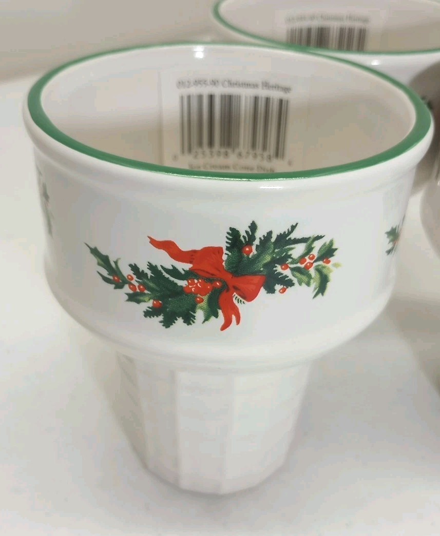 The Pfaltzgraff Christmas Heritage Ice Cream Cone Shaped Dish is a set of 3 stoneware dessert dishes featuring a wreath pattern in white. This original Pfaltzgraff design is part of their Christmas Heritage product line, making it a festive and decorative addition to any holiday table setting. The dishes are microwave and dishwasher safe, and have a glossy finish, adding a touch of elegance to your holiday celebrations. Made with art pottery techniques in China, these cone-shaped dishes are both functional and stylish for serving your favorite desserts during the Christmas season. ( 1 HAS CHIP ON BOTTOM BARELY NOTICEABLE FROM SIDE AT ALL PLEASE SEE PICTURES.)