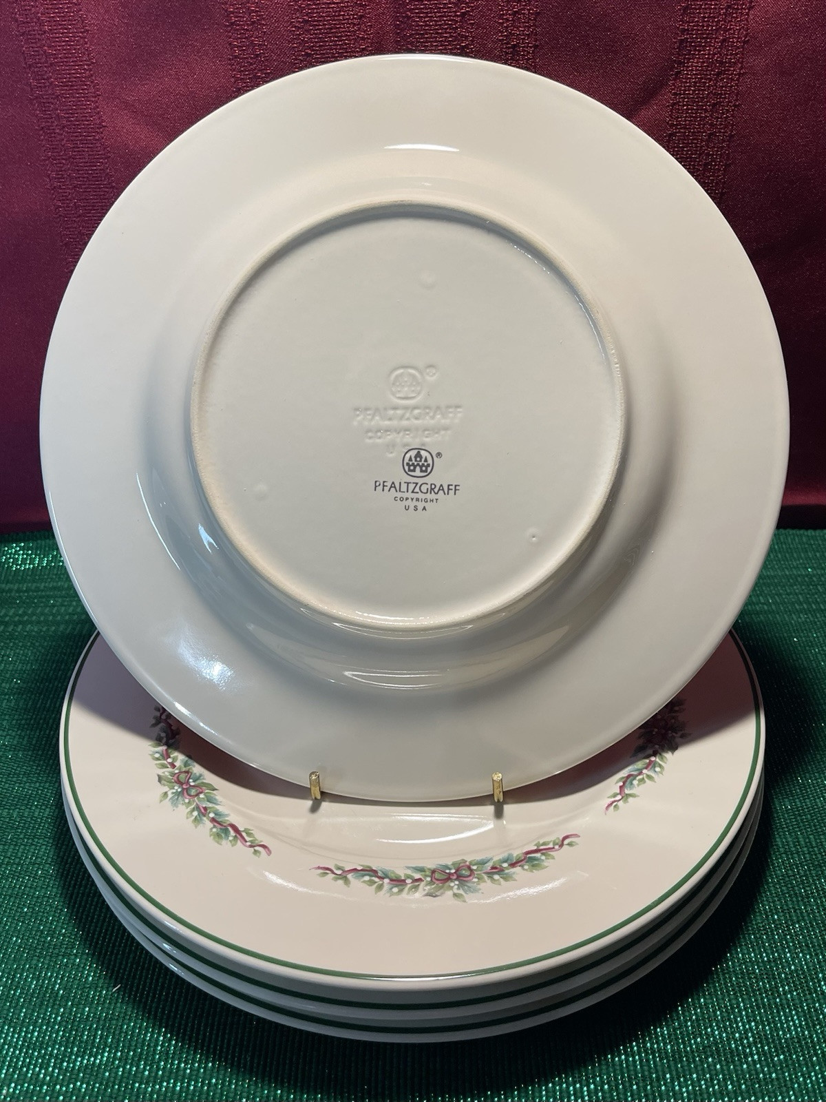 Set the table with four Pfaltzgraff "Holly Joy" dinner plates, featuring a festive Christmas design of mistletoe and fruit. These 10-3/8" round plates are from the vintage 1995 collection and are dishwasher and microwave safe. Made of glossy stoneware in the USA, they are stackable and decorative, perfect for holiday gatherings. They are retired. Plate stand not included. All reasonable offers will be considered. Please see pictures of the exact items.