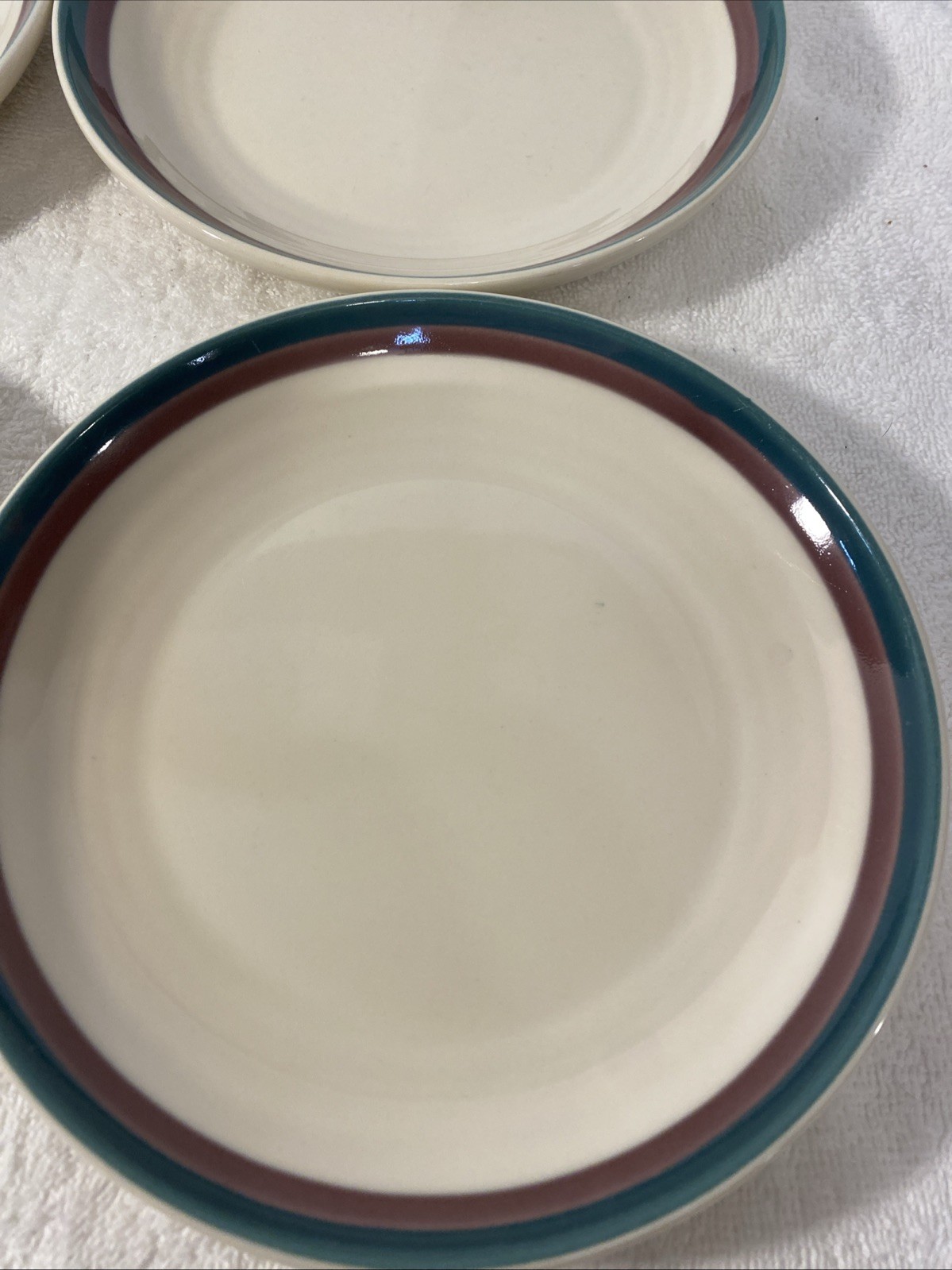 4 Pfaltzgraff Salad Dessert Plates JUNIPER Cream with Mauve & Teal Bands 6-3/4". Condition is Used. Shipped with USPS Ground Advantage.