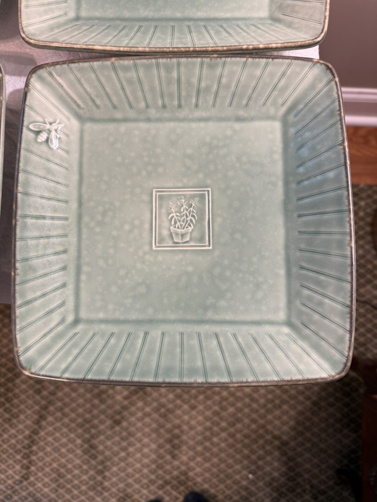 Pfaltzgraff Naturewood Serenity Green Square Plates Set of 4. I listed these as used but I have never used them but have had them for quite awhile. There are no chips or cracks. They measure approximately 8 3/4" x 1 1/8" high. These are absolutely beautiful plates. I have other pieces that I will be listing that match this set. If you have any questions please ask before bidding. Thanks.