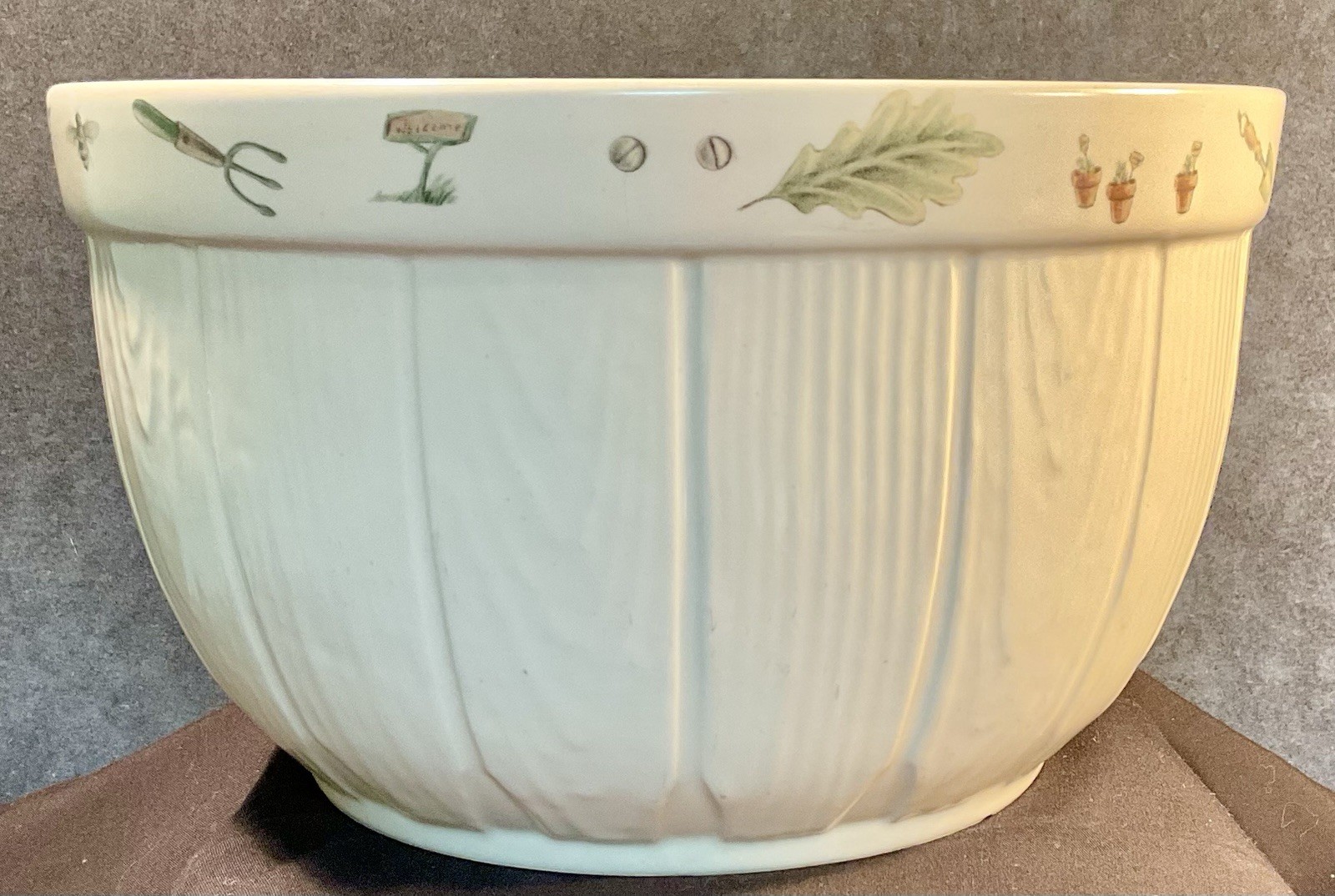 Botanically inspired portfolio of Pfaltzgraff Naturewood service ware features this large Bushel Basket Bowl. The Naturewood pattern was introduced by Pfaltzgraff in 1997. It remains a well loved and popular Pfaltzgraff pattern. The Naturewood Bushel Basket Bowl is 5-1/2” tall and 9-5/8” in diameter. It is a creamy ivory color with a wood grain exterior (like a bushel basket) with the rim embellished with leaves, gardening tools, and bees. The interior of the bowl is smooth and free of decoration. The Bowl could be used as a (deep) mixing bowl, a pretty serving bowl, or a great Family popcorn bowl. What could you use this big bowl for? The large Bowl is in very good to excellent condition with no nicks, chips, or visible utensil marks. Thanks for your interest!