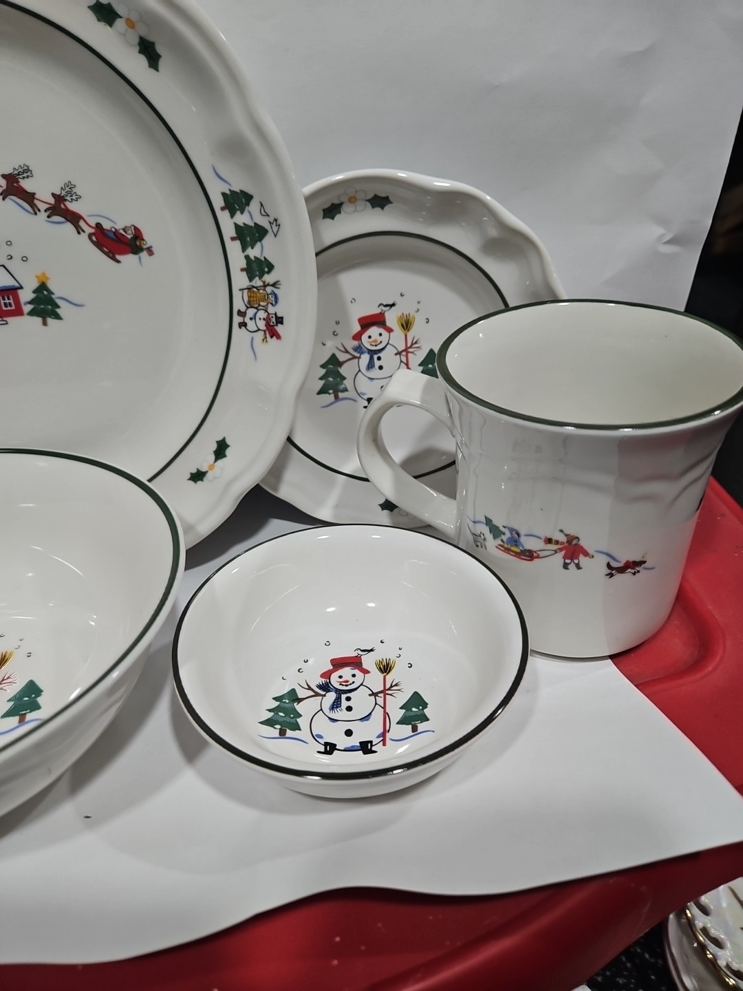 5 miscellaneous pfaltzgraff pieces. All in excellent condition. 4 inch bowl and 6 inch plate are snowman themed with pfaltzgraff stamp on bottom. 9 inch plate, 6inch bowl, and coffee mug all have pfaltzgraff logo and snow village printed on bottom
