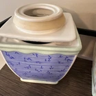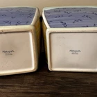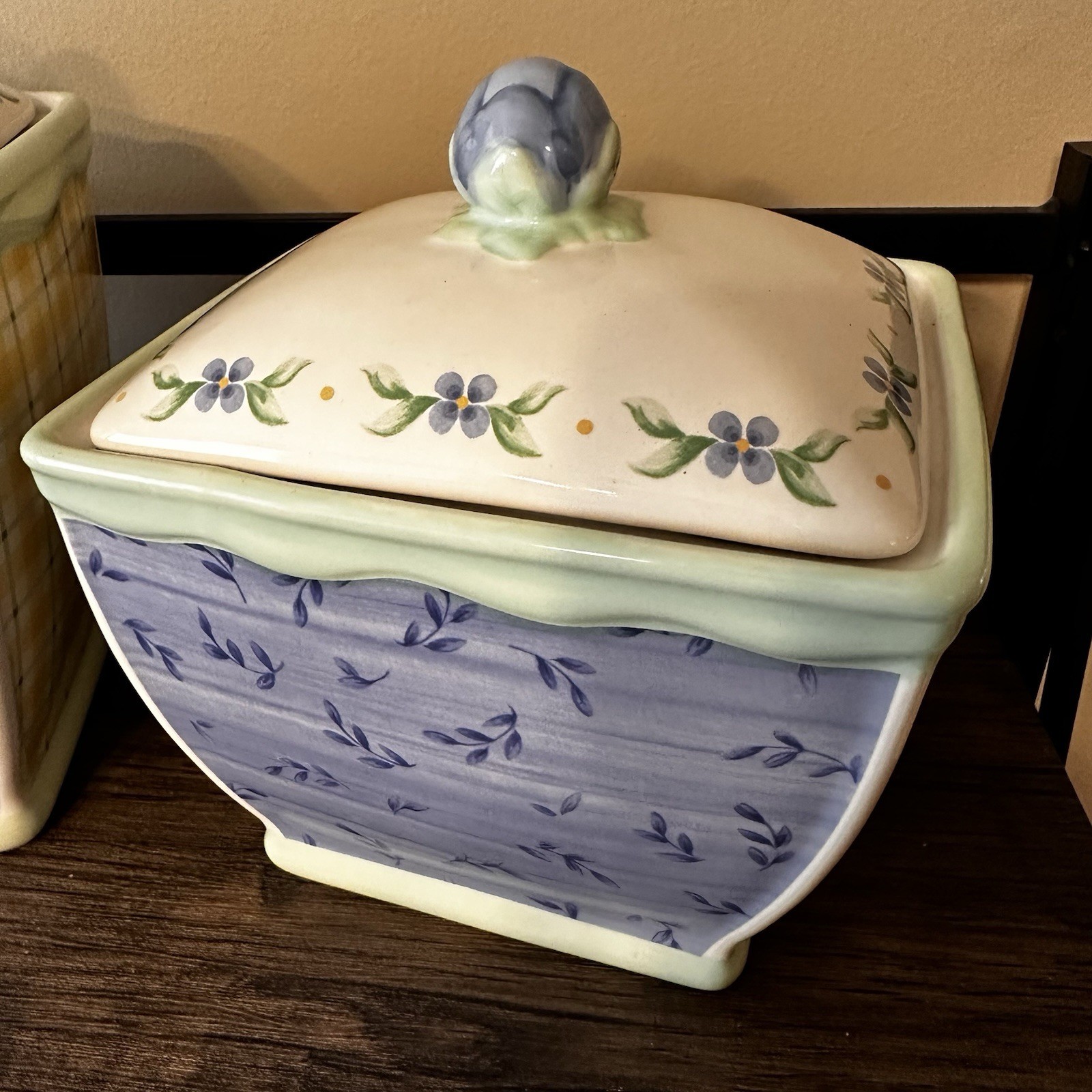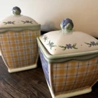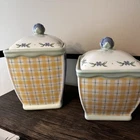 Excellent, preowned condition. This is a super cute set. Perfect for summer home, beach home. We're just an overall light and bright kitchen! They are both 7 inches wide and from the bottom to the top of the lid, one is 8 inches tall and the other is 10 inches tall