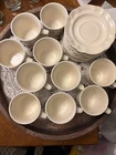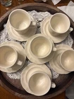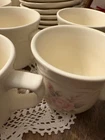 The Pfaltzgraff Tea Rose Pattern Set of 10 Cups and Saucers Stoneware is a charming and elegant collection featuring a floral Tea Rose design in pink flowers. Made of durable stoneware, these round mugs are perfect for serving coffee or tea. With a handle for easy gripping and suitable for hot beverages, this original Pfaltzgraff set is an ideal addition to any coffee or tea lover's collection. Made in the United States, these mugs showcase a floral theme and style, adding a touch of vintage charm to your kitchen decor.