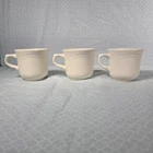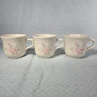 The Pfaltzgraff Tea Rose eight-piece set includes seven mugs and a creamer, all made of pink flower-patterned stoneware. This original United States-made collection features a round shape with handles, ideal for serving hot beverages. The Tea Rose design adds a floral touch to your table setting. See photos for exact condition. There is a small crack on the handle of one of the mugs. It is pictured. No other flaws are present.