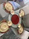 The Pfaltzgraff Village Dinnerware set includes 31 pieces in total, featuring a vintage design in beige stoneware. The set consists of 4 full place settings and additional plates. Perfect for serving meals or desserts, this charming set is a classic addition to any dining table. Look at the pictures and ask questions before making your purchase