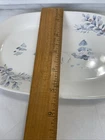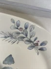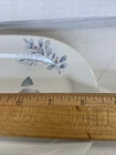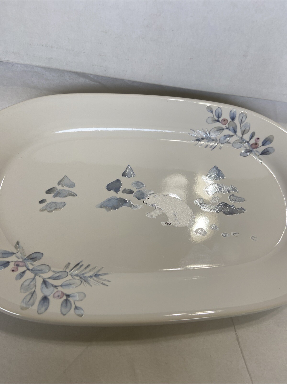 This is a Pfaltzgraff Winter Frost oval serving platter measuring 14.5 by 10.5 inches. The platter is off white with blue-grey and purple accents, made of stoneware, and features a nature theme. It is oven-safe, stackable, and dishwasher-safe with a glossy finish. The production style is earthenware, and it was manufactured in the United States. The backstamp is printed on the platter. Gorgeous. Never used. Mint I have multiple pieces!