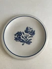 This Pfaltzgraff Yorktowne dinner plate is a vintage piece made in the USA during the late 20th century. The round plate features a rustic primitive Americana farmhouse style with a blue flower pattern on matte stoneware material. Measuring 10 1/4" in diameter, it is microwave and dishwasher safe, making it suitable for all occasions. The decorative plate is part of the Yorktown product line and carries the impressed backstamp of Pfaltzgraff.