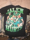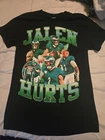 Crafted for the sports enthusiast, this Jaylen Hurts graphic tee is a must-have for any fan's wardrobe. In a versatile black hue, the shirt features a regular fit designed to provide comfort for all-day wear. The short sleeves make it an ideal choice for warmer days or layering under jackets and hoodies.The shirt comes in a small size, tailored to fit men's regular size preferences. Emblazoned with vibrant graphics that celebrate the energy of the game, this NFL-branded tee effortlessly combines style with sports passion. Whether you're at the stadium or on the streets, it's a subtle nod to your favorite athlete and a bold statement of team pride.