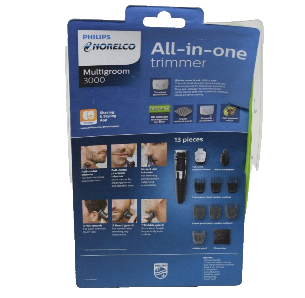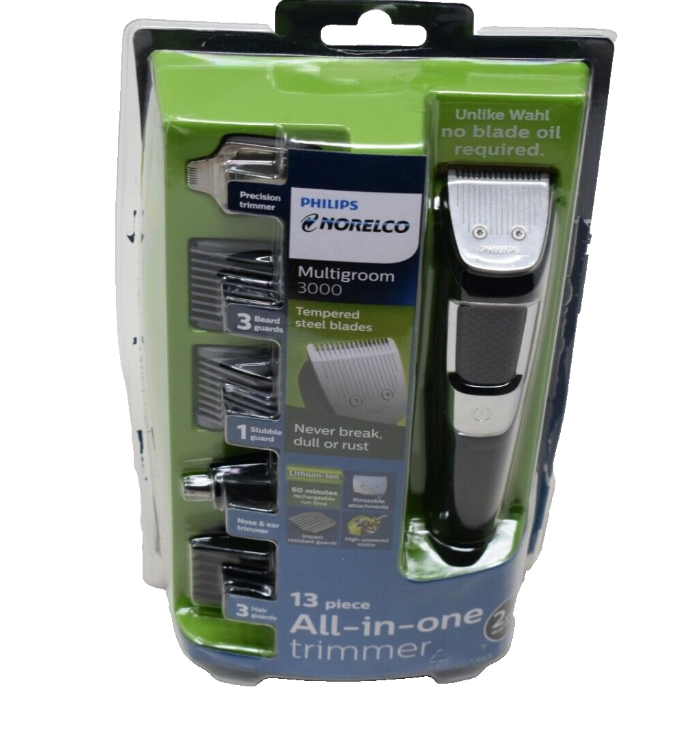 Philips Norelco Multigroom All In One Series 3000 13 attachments NEW Slight Dmg Box (1) Philips Norelco Multigroom All In One Series 3000 13 attachment trimmer 13 pieces for all of your grooming needs: Beard and stubble trimming and maintenance, precision trimmer allows exact placement for sharp lines, nose and ear trimmer taking care of unwanted hairs DualCut technology: 2x more self-sharpening blades. The steel blades sharpen themselves as they work Easily clean blades and guards by detaching from handle and rinsing under water Powerful lithium battery delivers up to 60 minutes of run time.