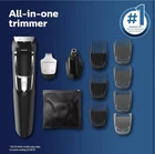 Philips Norelco Multigroom Trimmer, Series 3000, MG3750 ( R4(7) Used, Tested it works. The DualCut trimmer blades sharpen themselves as they work, resulting in longer lasting, maintenance-free blades. Unlike the competition, NO BLADE OIL IS NECESSARY. Steel blades and guards are easy to detach and rinse, allowing for quick cleaning without worrying about rust. Rechargeable lithium ion battery offers 60 minutes of use. The trimmer can be used even while charging, or after a 5 minute quick-charge. Use for all hair types, moustaches, and beards. Includes: Steel trimmer, steel precision trimmer, nose and ear trimmer, 3 hair trimming guards, 3 beard trimming guards, stubble guard, accessory travel storage bag, and cleaning brush.