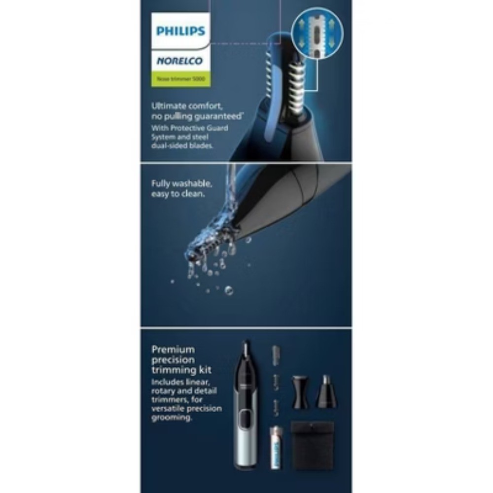 Description Groom unwanted facial hair using the Philips Norelco Nose Trimmer 5000, the ultimate precision trimming kit. The Protective Guard System provides the ultimate comfort while the rotary and detail trimmers cuts close. The detail trimmer is ideal for perfecting sideburns and edges. Use the eyebrow attachments to evenly trim your eyebrows. The long-lasting alkaline battery provide multiple usage and the pouch makes the trimmer easy travel. The nose trimmer is fully washable, making it easy to clean by simply running under a warm faucet. Groom your unwanted facial hair, while protecting your sensitive skin with the Philips Norelco Nose Trimmer 5000. The Protective Guard System protects sensitive skin by providing a barrier between skin and blades. Dual-sided steel blades efficiently cut unwanted hair without pulling. The detail trimmer is ideal for perfecting sideburns and edging beards. Includes linear, rotary and detail trimmers, AA battery, pouch and 2 eyebrow guards. Packaging switched from plastic to paper. Shop products with packaging that's designed to reduce waste. Together, we're creating packaging solutions that are designed from recycled or renewable materials. Packaging uses plastic alternative such as FSC-certified paper, aluminum, steel, or glass with great potential to be widely circular for majority of product packaging. This item's packaging is made with up to 97% plastic alternative materials. Two Year Warranty. highlights Trim unwanted nose, ear and eyebrow hair with the Philips Norelco Nose Trimmer 5000. AA battery for long lasting performance. The Protective Guard System protects sensitive skin by providing a barrier between skin and blades Dual-sided steel blades efficiently cut unwanted hair without pulling. Trimmer and the combs are water resistant, rinse it with water it after each use. Includes linear, rotary and detail trimmers, AA battery, pouch and 2 eyebrow guards. Packaging switched from plastic to paper. Two Year Warranty.