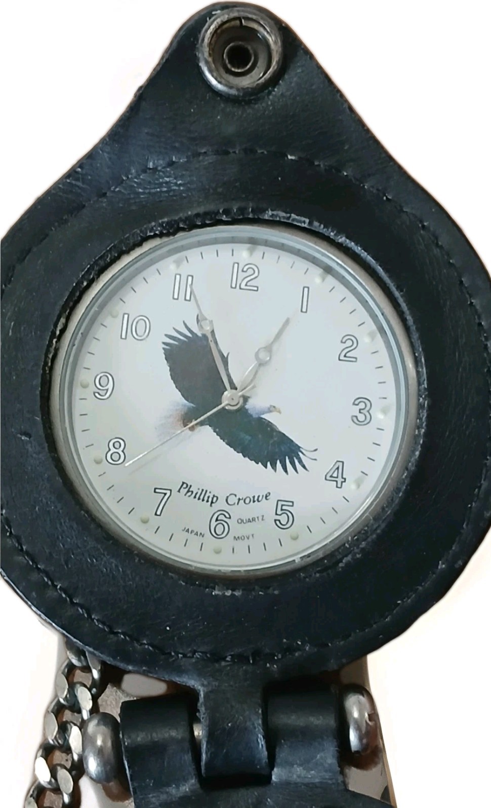 🦅 Classic Eagle Pocket Watch w/ Leather Case & Chain This Phillip Crowe pocket watch features a bold eagle dial design with a quartz movement housed in a leather protective case , complete with a matching chain and clip . A great piece for collectors or anyone who appreciates classic wildlife-themed timepieces. The watch is pre-owned and shows wear consistent with age and use, primarily on the leather case (surface wear and natural aging). The watch has not been tested and will likely need a new battery. No further testing has been performed. You will receive the exact item shown in the photos. ✔ Condition • Pre-owned with minor wear • Leather case shows surface wear and aging • Watch functionality untested (battery needed) • No cracks noted to the crystal • Chain and clasp included ✔ Measurements (approximate) • Watch face: 1⅝" x 1⅝" • Watch with leather case: 2½" across • Length (open): 9" • Length (closed): 6¼" • Chain length: 12" (about **13½" including clip) 📦 Ships quickly and carefully by the next business day. --- 🗝 Pocket Watch • Eagle Watch • Wildlife Timepiece • Leather Pocket Watch • Quartz Watch • Collector Watch • Vintage Style Watch • Gift Idea --- 🔎 #PocketWatch #PhillipCrowe #EagleWatch #WatchCollector #QuartzWatch #LeatherCase #MensAccessorie