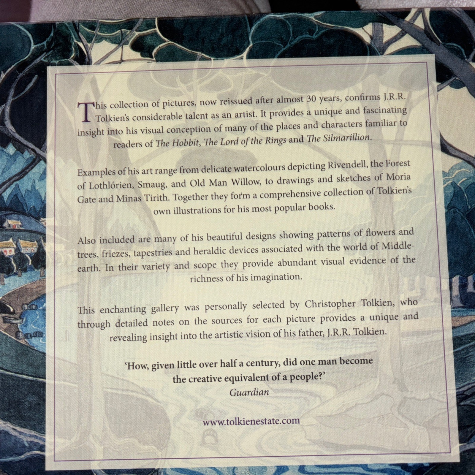 "Pictures by J. R. R. Tolkien" is a 2021 hardcover book featuring the artwork of renowned author J.R.R. Tolkien. Published by HarperCollins, this book includes 104 pages of illustrations showcasing Tolkien's techniques in drawing, as well as his interest in popular culture and history. Measuring 10 inches in length and width, and 0.7 inches in height, this hardcover book is a valuable addition to any art enthusiast's collection, offering a unique glimpse into the imaginative world of J.R.R. Tolkien through his artwork.