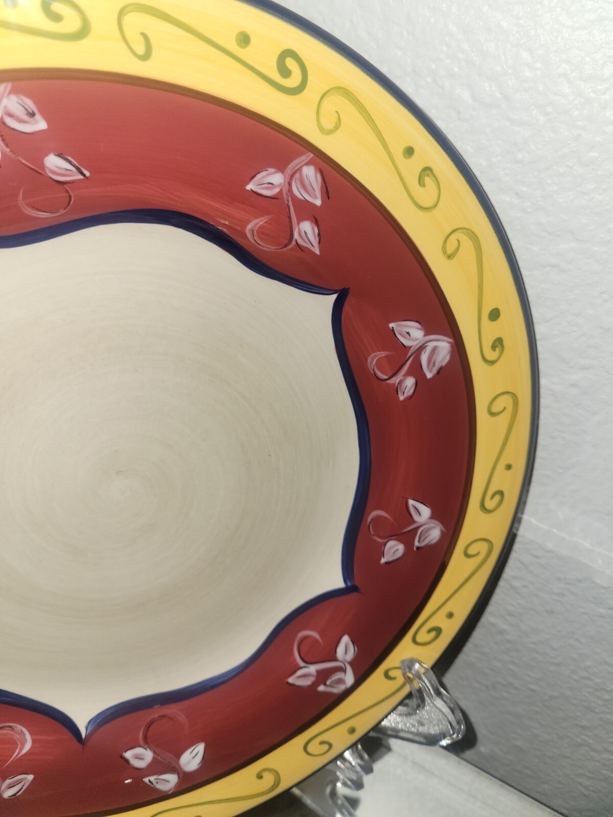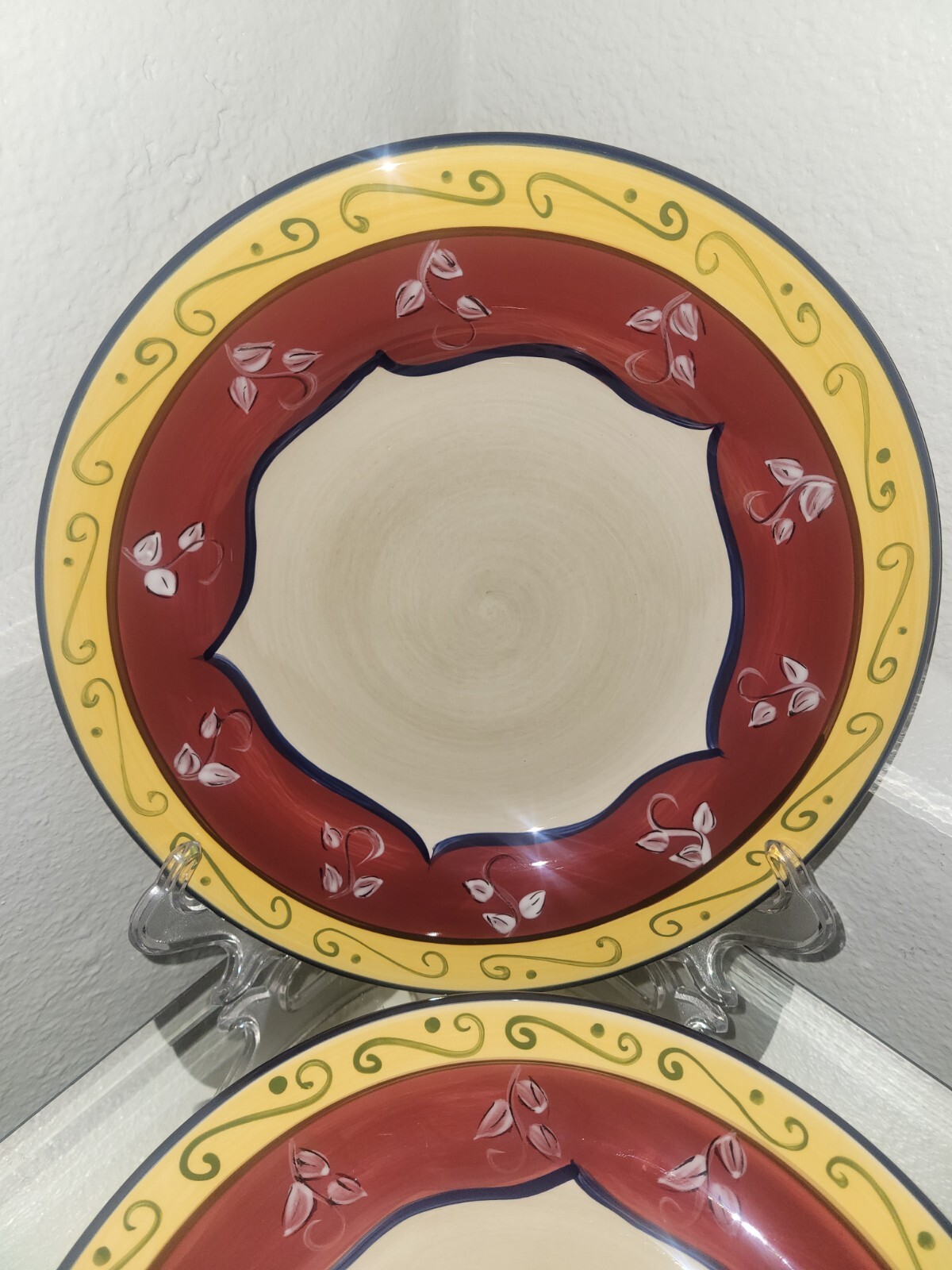 The Pier 1 Imports Hand Painted Vallarta Dinner Plate Set of 4 offers a blend of artisanal craftsmanship and Tuscan-inspired design. Each 11¼" plate is meticulously hand-painted, showcasing vibrant colors and intricate detailing. Perfect for elevating any dining experience, these plates exude elegance and charm, making them an ideal addition to any table setting or collection.