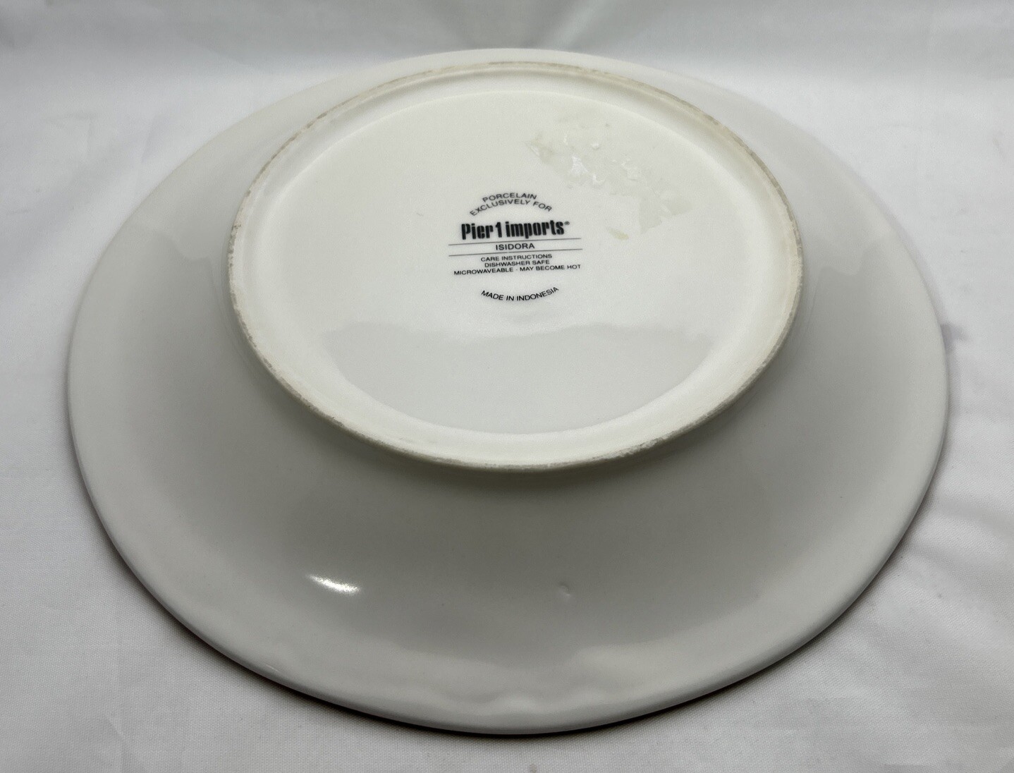 Add a touch of contemporary elegance to your dining table with this beautiful Pier 1 Imports Isidora Salad Plate. The round stoneware plate measures 9 inches in diameter and features a colorful hand-painted floral pattern on a glossy, earthenware finish. The plate is part of the Isidora product line and is an original, licensed reproduction from Indonesia. Perfect for all occasions, this adult salad plate is a must-have addition to your decorative cookware, dinnerware, and serveware collection. The plate's production technique is pottery, and it has a printed backstamp. The set includes one plate, making it a great choice for a single serving or for sharing with a loved one. Enjoy your meals in style with this stunning Pier 1 Imports Isidora Salad Plate! 00g0w9s9x