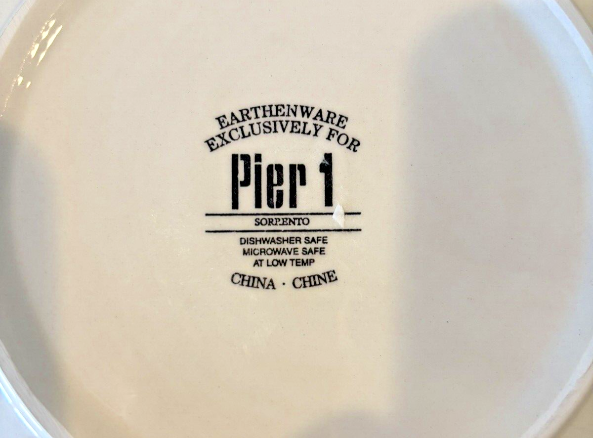 The Pier 1 Imports Sorrento Bowls are a set of three round earthenware bowls with an olive design, each measuring 8.75 inches in diameter. These contemporary bowls are stackable and decorative, featuring a glossy finish and a printed backstamp. The set is suitable for all occasions and is part of the Sorrento product line, offering a stylish addition to your kitchen or dining area. Made using pottery production technique, these bowls are perfect for serving various dishes while adding a touch of charm to your table setting.