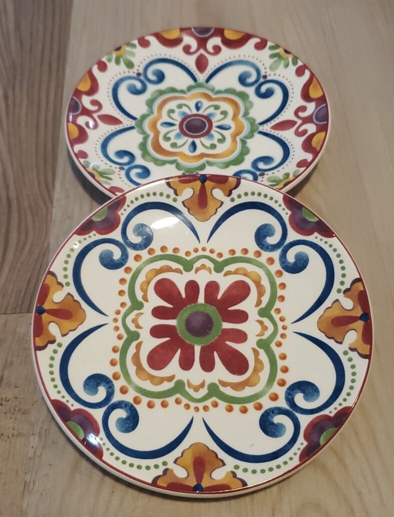 Pier 1 Imports Ironstone Global Medallion Round Dessert Bread Plates Set of 2 6". Very Nice Pre Owned Condition 00198gw