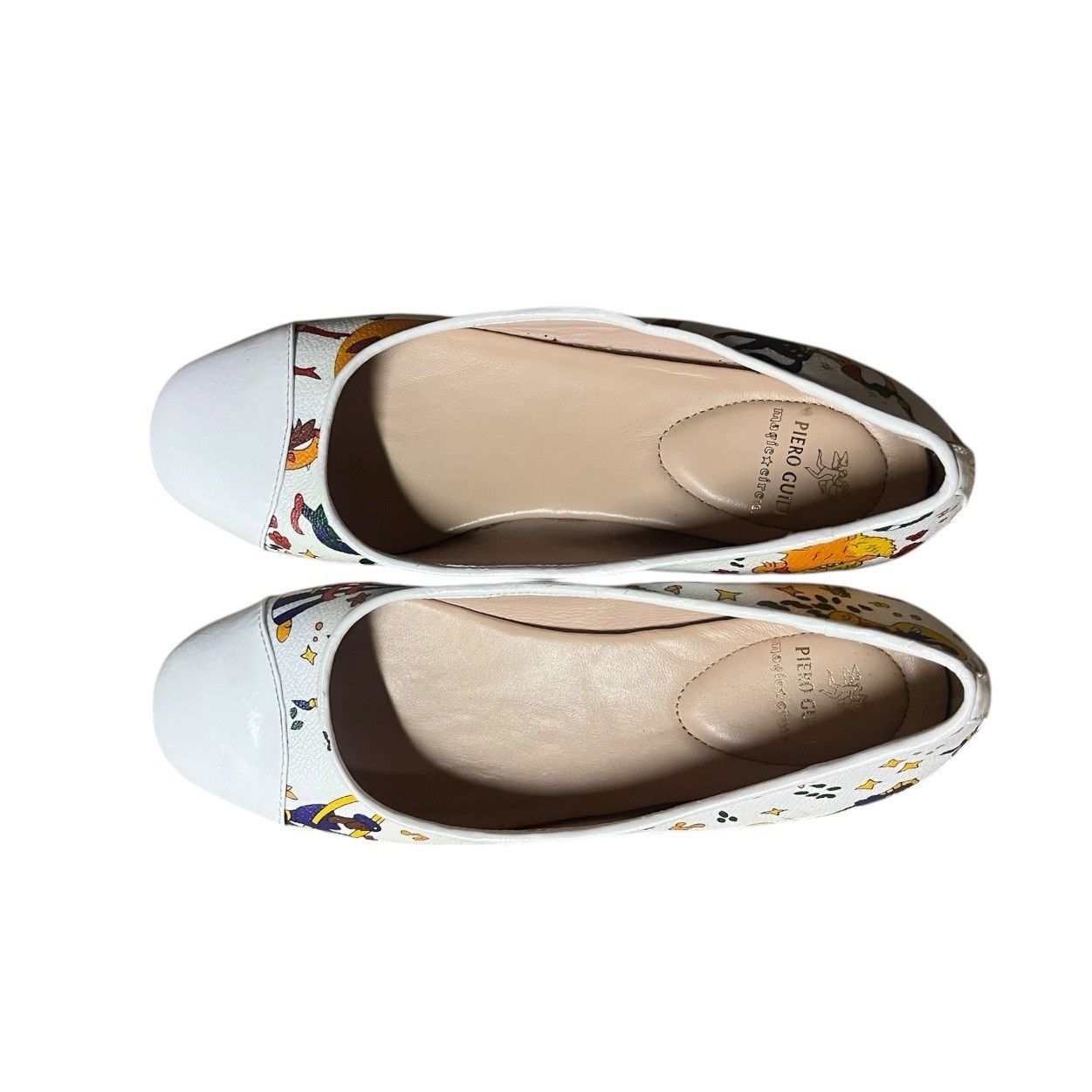The Piero Guidi Magic Circus Ballet Flats are a rare and funky pair of women's shoes in size EU 37 (US 7). Made of leather with a white color and artistic theme, these flats feature a unique design that combines art and style. The Piero Guidi brand is known for its attention to detail and high-quality craftsmanship, making these shoes a special addition to any woman's wardrobe. Excellent, like new condition.