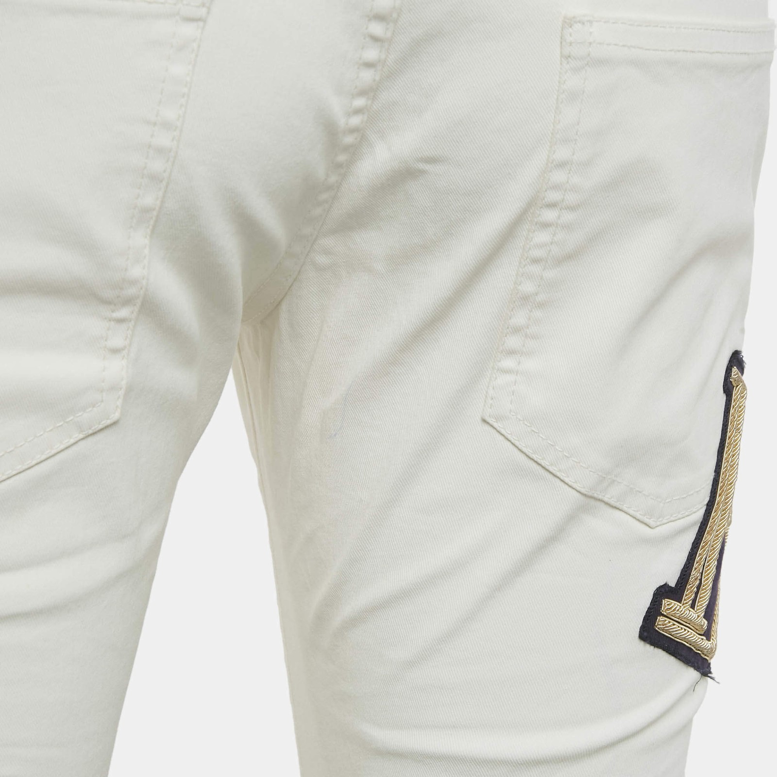 Our eBay Store About Us Contact Us Add to Favorite Sellers Pierre Balmain White Denim Applique Skinny Jeans L Waist 32 A luxe take on denim, these white Pierre Balmain jeans come with a contrasting B logo detail. The skinny fit and signature hardware make them anything but basic. Product Details Brand Pierre Balmain Size LARGE (Size 33) Color White Includes The Luxury Closet Packaging Certified by The Luxury Closet This item has gone through a detailed authentication process overseen by our experts. We offer a lifetime guarantee of authenticity on all our items. How We Check The in-house team of experts at The Luxury Closet is highly trained to verify the authenticity and the condition of the luxury products. They ensure that only 100% authentic items are put on sale.The evaluation process is unique with its own mix of assessment criteria and differs according to the category. Each item is evaluated based on the following combination of hallmarks, hardware, stitching, symmetry, material, craftsmanship, stamping, codes, hologram stickers, and packaging. Our authenticators also check if the items have been modified or amended (e.g., aftermarket diamonds, replaced batteries, repaired bags, etc.) International Buyers Import duties, taxes and charges are not included in the item price. These charges are the buyers responsibility. Please check with your country’s customs office to determine what these additional cost will be prior to buying.