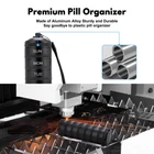 7-Day Pill Organizer: Our pill organizers feature 7 large compartments capable of holding a maximum of 30 capsules(0.68in), 8 fish oils(0.99in), or 18 vitamins(0.8in). Compartment are divided into 7 days, with each one permanently marked by an icon to remind you to take your pills on time. Premium Metal Material: Constructed from ultra-strong and anodized aluminum, this metal pill organizer is more robust than plastic ones and won't get crushed if accidentally dropped on the ground. Say goodbye to plastic pill organizers. Waterproof & Airtight: Each compartment is equipped with silicone O-ring gaskets, making it airtight and waterproof, ensuring the safety and dryness of your pills inside. This maximizes their freshness and extends their shelf life. Easy-to-Use Pill Organizer: Each compartment of the travel pill organizer is designed with a gentle texture that improves grip, making it easy to unscrew and close. The spin locking system ensures that the pill box never pops open. Compact and Portable: The slim and compact design makes weekly pill organizer ideal for everyday or travel use. Put it into your purse, backpack, and you can take a week's worth of medication with them wherever you go.