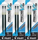 Pilot's high quality refills and accessories extend the life of Pilot products, creating ultimate value; an economic and environmentally-friendly option. Point Type: Fine 0.7mm Smooth and skip-free writing Delivers precise and clean lines 3 colors available for fine point Each pack includes 2 refills. Sold as set of 3 Packs. Refill fits the following pens: Precise V7 RT retractable . About Precise V5/V7/V10 RT Pens There is a fine line between good and great and that line is drawn with Pilot Precise. Precise rolling ball retractable pens are designed to deliver the same kind of premium, precision writing experience as the capped version. Precise combines Pilot's exceptionally smooth writing ink, premium metal accents, and comfortable grip for a go anywhere sophisticated writing experience. Precise is ideal for those who prefer retractable pens and demand superior writing performance. Precision tip delivers a precise, clean line every time Retractable convenience with sophisticated metal clip Patented Precision Point Technology for smooth, skip-free writing Rubber grip with traction pockets Airplane safe system Refillable