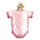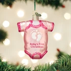 Pink Baby Outfit (Baby's First Christmas) 3.25" Glass Ornament Reverse side is blank, you can use a permanent marker to personalize if desired. In the Victorian era, infants were dressed in miniature versions of adult clothing. At their most relaxed, babies were dressed in white gowns. It wasn t until the 1950s that Walter Artzt designed the first baby onesie, creating a comfy & simple way to keep infants cozy. . With glitter embellishment. Each figural glass ornament produced by Old World Christmas is hand crafted in age-old tradition using the same techniques that originated in the 1800's. Molten glass is mouth-blown into finely carved molds available only to Old World Christmas, before a hot solution of liquid silver is poured inside. The ornaments are then hand-painted and glittered in a series of labor-intensive steps to achieve the beautiful creations. . Item is NEW - packed in a Old World Christmas Brand Gift Box Powered by