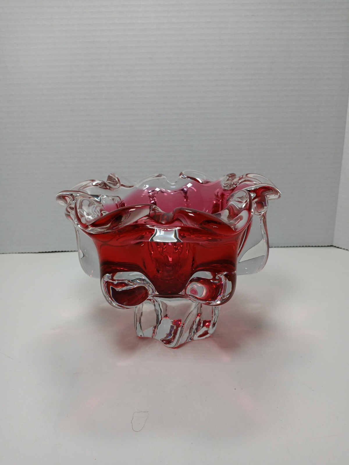 This Pink Cranberry Art Glass Lead Crystal Footed Bowl is a stunning piece of abstract glass art from approximately the 1970s. The bowl features a vibrant red and clear color palette, making it perfect for any occasion. Made of high-quality lead crystal glass with a glossy finish it is sure to add a touch of elegance to any collection or kitchen decor. The unique shape and pattern of this bowl make it a standout piece for collectors of art glass or those who appreciate intricate and whimsical designs. Approximately 5" T. x 7.25 W. and weighs 4lbs, 5.25 oz.