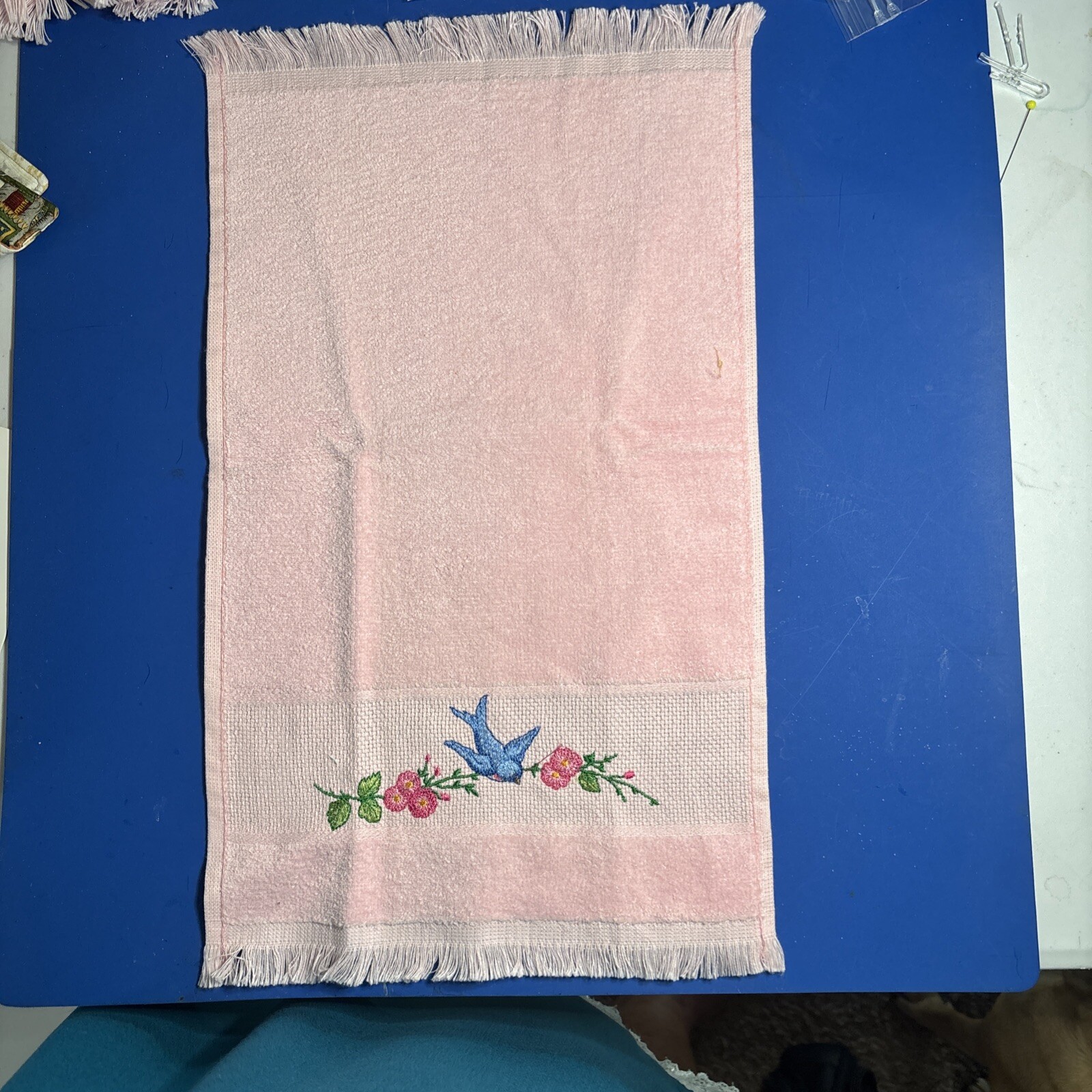 This hand-stitched guest towel features a charming bird pattern in a soft pink color, perfect for adding a touch of whimsy to your bathroom decor. Made from 100% cotton, this towel is not only soft and absorbent but also durable for repeated use. With dimensions of 11 inches wide and 18 inches long, this towel is ideal for drying hands and adding a decorative touch to your bathroom.