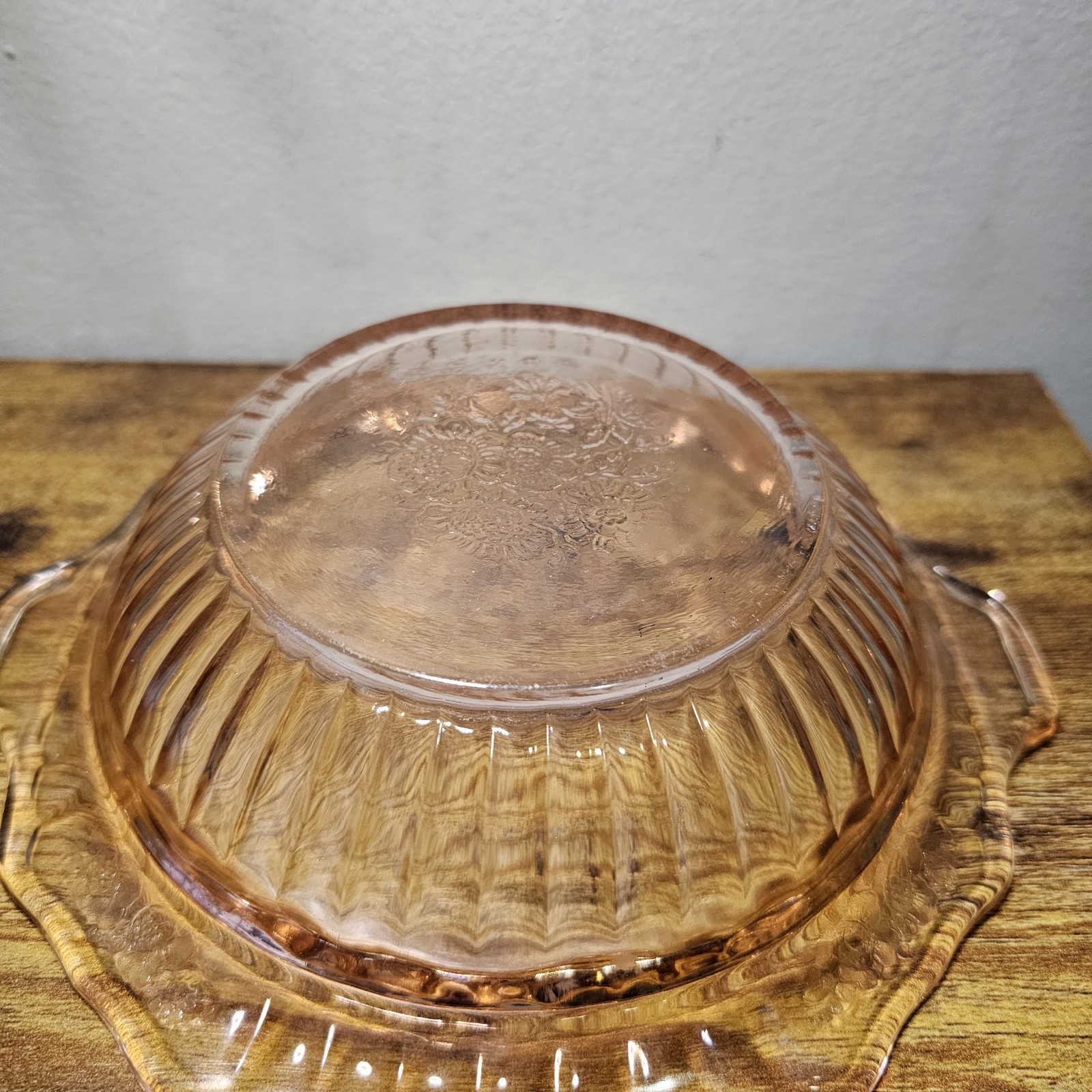 This vintage Anchor Hocking glass bowl in the Mayfair/Open Rose pattern features a glossy pink finish. It has handles for easy serving and is suitable for all occasions. Made of glass. Hand wash only.