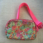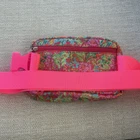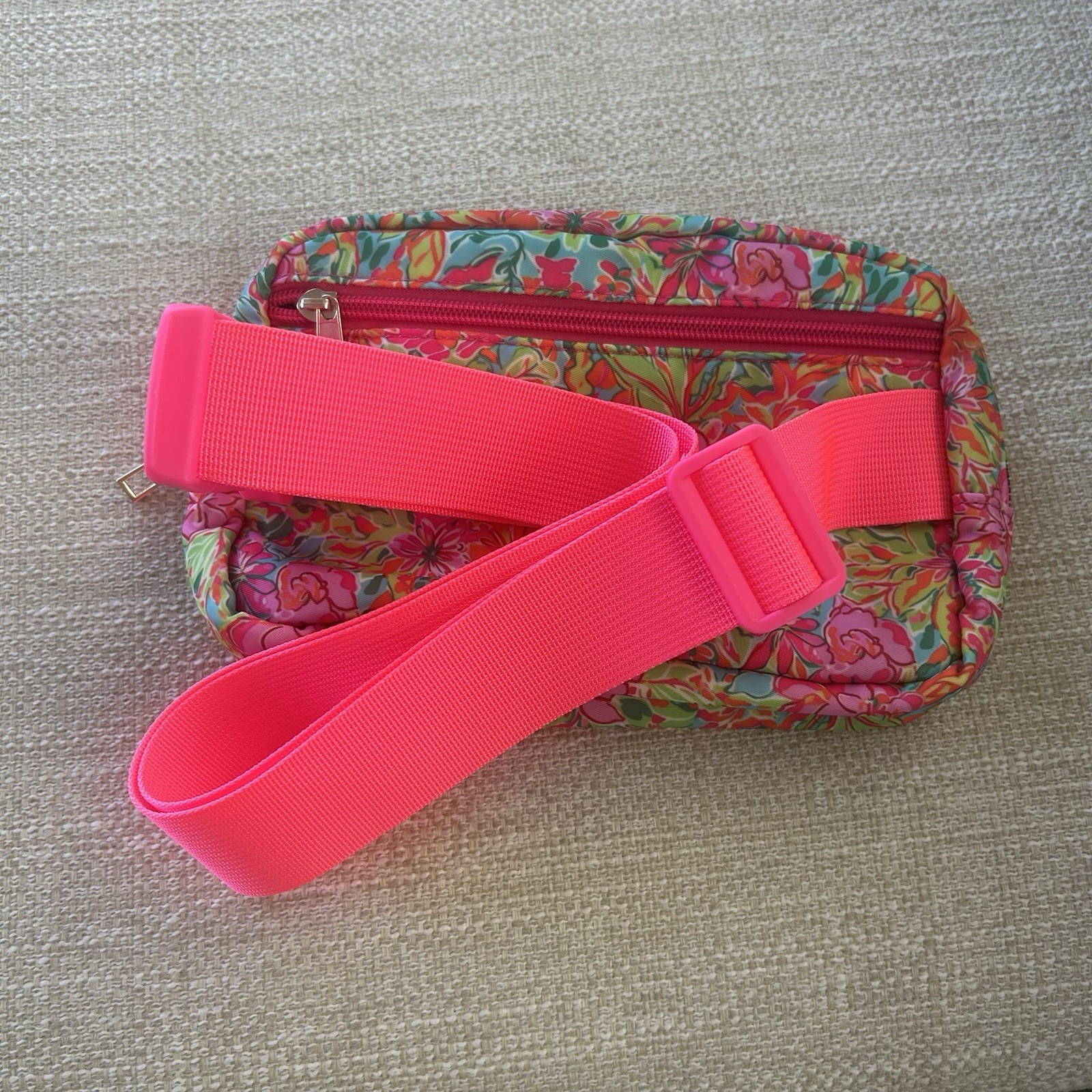 This is a new women's crossbody belt bag with a pink floral pattern and zip closure. The exterior is made of polyester and the lining is pink. The bag has four pockets and an adjustable strap. It also comes with a detachable strap. The bag is small in size and is perfect for everyday use.