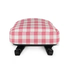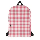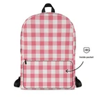 This medium size backpack with a pink and white gingham print is just what you need for daily use or sports activities! The pockets (including one for your laptop) give plenty of room for all your necessities, while the water-resistant material will protect them from the weather. It makes a great back to school or back to college gift! • Made from 100% polyester • Dimensions: H 16⅞" (42cm), W 12¼" (31cm), D 3⅞" (10cm) • Fabrig weight: 9 oz./yd.² (305 g/m²) • Maximum weight limit: 44lbs (20kg) • Water-resistant material • Large inside pocket with a separate compartment for a 15” laptop, front pocket with a zipper, and a hidden pocket with zipper on the back of the bag • Top zipper has 2 sliders with zipper pullers • Silky lining, piped inside hems, and a soft mesh back • Padded ergonomic bag straps from polyester with plastic strap regulators • Blank product components sourced from China This product is made especially for you as soon as you place an order, which is why it takes us a bit longer to deliver it to you. Making products on demand instead of in bulk helps reduce overproduction, so thank you for making thoughtful purchasing decisions! NOTE: Please keep in mind that colors can sometimes appear slightly different due to variations in screen resolutions and device settings.