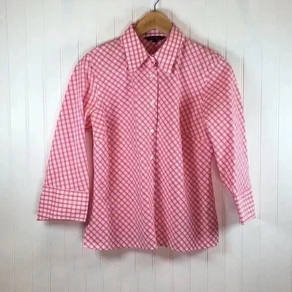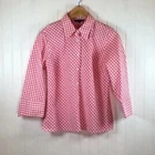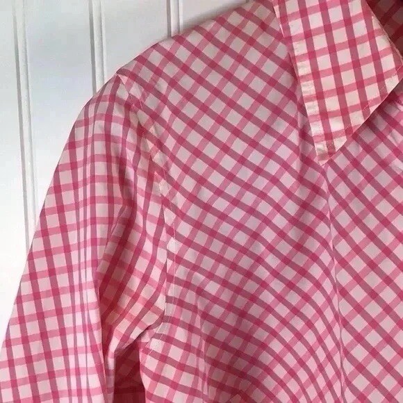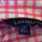 This is a petite size 10P button-up blouse from Lands' End, designed in a pink gingham pattern. Perfect for women, this top can be a stylish addition to your wardrobe. This pink gingham button-up blouse from Lands' End is the perfect addition to any petite woman's wardrobe. The blouse is crafted with high-quality materials and features a unique design that will make you stand out from the crowd. It's perfect for any occasion, whether you're going to work or out for a night on the town. The blouse is available in size 10P and features a button-up front, making it easy to put on and take off. The pink color adds a pop of color to any outfit, and the petite size ensures a perfect fit. Don't miss out on the chance to add this beautiful blouse to your collection.