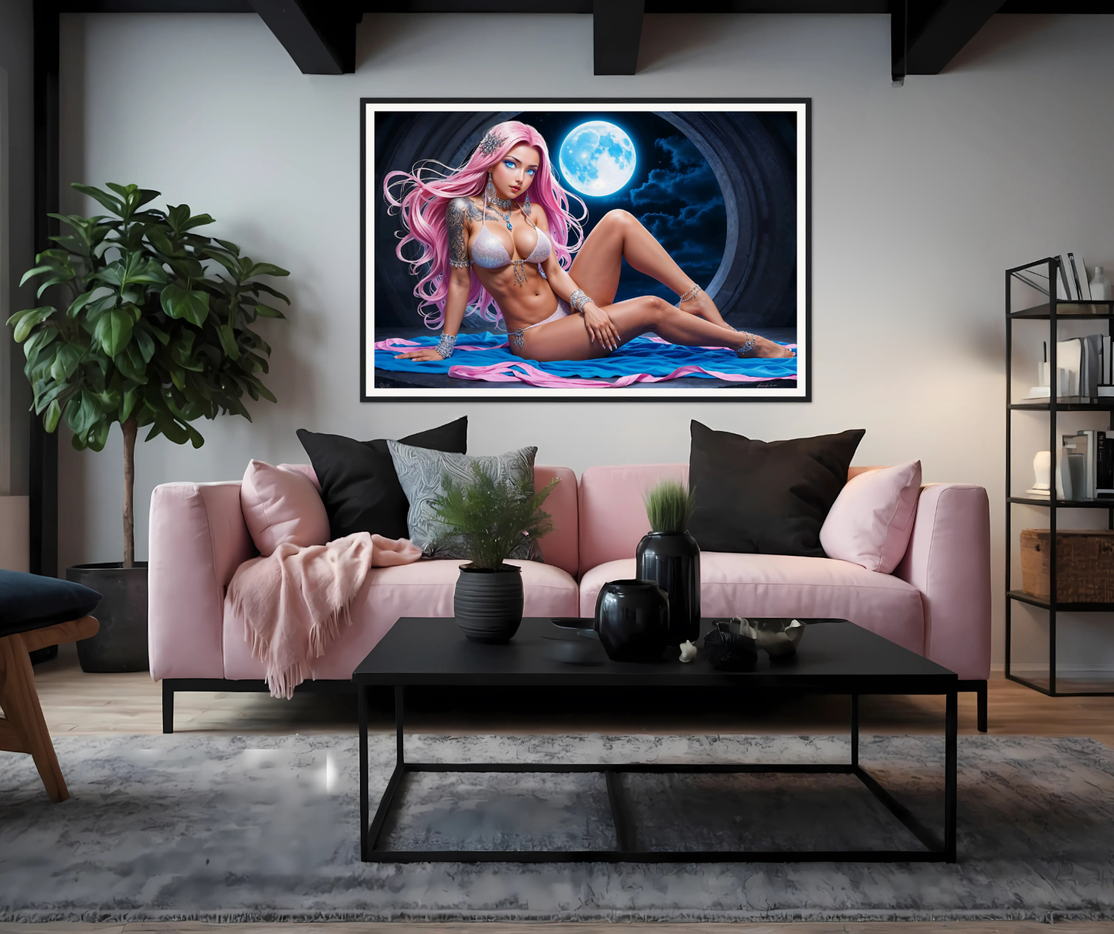 Unveil the enchanting beauty of the Pink Moon Goddess by Hypnotik Creations, a mesmerizing illustration that captivates with ethereal grace and magnetic charm. This artwork features a stunning royal woman with long, flowing pink hair and hypnotic blue eyes that seem to draw the viewer into a world of celestial mystery. Her captivating form, amazing figure, and elegantly posed, attractive legs are tastefully highlighted in a two-piece outfit that combines fantasy allure with sophistication. The glowing full moon behind her bathes the scene in a gentle, mystical light, creating an evocative contrast against her powerful and graceful stance. Each print is meticulously crafted on premium photo paper, bringing the intricate details of this illustration to life, and is encased in a black, handcrafted pine wood frame for timeless elegance. Available in three sizes and two finishes—matte for a softer appearance or semi-gloss for vibrant color depth—this piece can suit any interior style. The subtle off-white outline makes it adaptable to both dark and light walls, adding versatility to its aesthetic appeal. This artwork is more than decor; it's an invitation to a world of fantasy and sophistication, certain to captivate and inspire. Description Our sturdy handcrafted wooden framed prints are ready to hang and made with master's edition, museum-quality photo paper—perfect for art lovers seeking luxury and world-class quality: Ready-to-hang: Includes hanging kit, ready to hang directly on the wall. Frame Material: Durable pine wood. Frame Color: Black, showcasing the distinct wood grain. Frame Measurements: 20-25mm (0.79"-0.98") thick, 10-14mm (0.4"-0.6") wide. Paper Weight: 250 gsm (110 lb), Thickness: 0.29 mm (11.4 mils). Paper Finish: Matte, uncoated, natural white (off-white) & Semi-Gloss, enhances colors with a subtle shine. Protection: Shatterproof plexiglass protects the poster. Sustainable Paper: FSC-certified materials or equivalent. Available Sizes: 18x12, 24x16 and 36x24 Packaging The posters are placed within frames upon arrival. The frames come pre-packed with corners and wrap and then packed in a box with strong edges to protect the frames. I-beams are used in addition, to give the package additional sturdiness and delivered safely to your doorstep. If there are any problems with your order, don't hesitate to contact us and we will do whatever is necessary to fix that issue for we value your business. * Shipping to Alaska, Hawaii, and unincorporated territories of the United States can take additional 7 ? 12 business days, weather permitting.