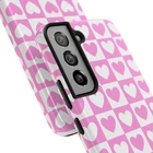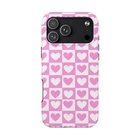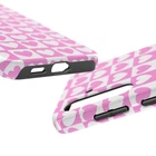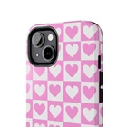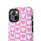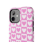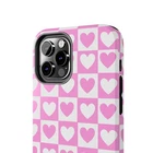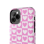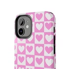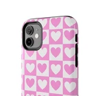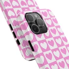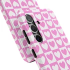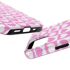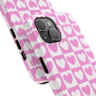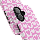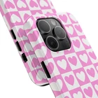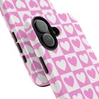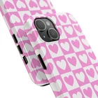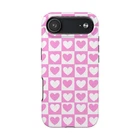 A cheerful phone case that brings a playful, nostalgic vibe to everyday life. Soft pink and white hearts sit in a tidy checkerboard, like a pocketful of paper valentines. The slim two-piece shell snaps on easily and the rubber liner cushions against drops while the raised bezel keeps the screen from resting flat on surfaces. It slips into a bag or pocket without bulk and holds up to daily wear thanks to a glossy, UV-protected finish that keeps colors bright. Give your phone a touch of sweet, confident style — a little reminder of joy that travels with you from morning coffee runs to late-night texts. Product features - Durable polycarbonate shell with impact-resistant Lexan plastic - Flexible TPU rubber liner for shock absorption and 2-piece impact dispersion - Lay-flat bezel protects the screen from scratches - Glossy, UV-protected finish keeps colors vibrant outdoors - Supports wireless charging (non-MagSafe) and fits iPhone 17 series Care instructions - Clean with damp cotton or microfiber cloth. Add a drop of dish soap to the cloth if needed.