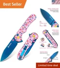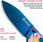Pink Pocket Knife for Women Men, " Blade Small EDC Knife, 14C28N Steel Button Lock Knife, Unique Design G10 Handle Folding Utility Knife HIGH-PERFORMANCE 14C28N BLADE: The blade of this cute pocket knife is coated with blue titanium and crafted from 14C28N steel, renowned for its exceptional resistance to corrosion, edge retention, and effortless cutting ability. EYE-CATCHING DESIGN G10 HANDLE: With its playful combination of pink and blue handle colors, the pink pocket knife is as fun as a sprinkle-coated . It's sure to turn heads wherever you go. Crafted with precision and practicality in mind, this ergonomic folding utility knife has a lightweight design that fits comfortably in your hand. THREE WAYS TO OPEN BUTTON LOCK KNIFE: Combined with a thumb stud opener and a flipper, this pink folding knife allows for quick and effortless one-handed deployment, providing a secure and easy-to-use locking system for safe operation. DISAPPEARS IN YOUR POCKET: Designed with functionality and convenience in mind, this deep-carry tip-up pocket clip allows for discreet and secure placement in your pocket. Whether you need a reliable urban knife for running, going out alone, or handling other daily challenges, this mini EDC knife is up to the task. PERFECT GIFT FOR EVERY WOMAN AND MAN: Searching for survival gear for women men? Look no further! These small pocket knives & folding knives are ideal gifts for your wife, mother, grandmother, daughter, granddaughter, sister, or girlfriend, partner, groomsman,or anyone else special in your life. Imagine the joy on your loved one's face as she opens her gift on Christmas morning, Mother's Day, birthday, Graduation or even Valentine's Day.