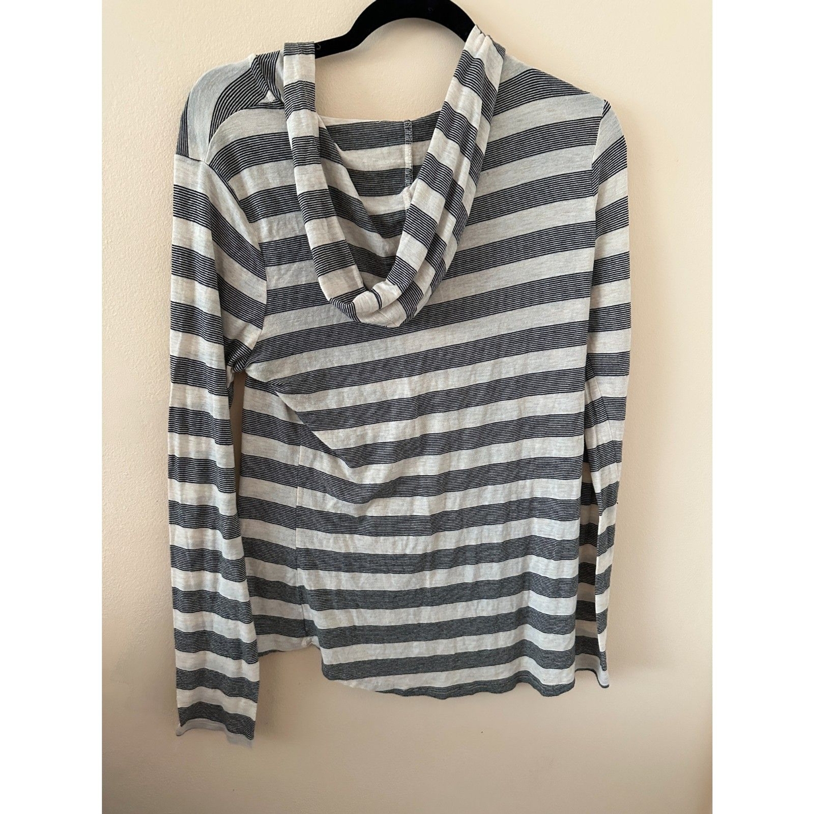 Pink Rose Oatmeal color with black stripes, front pocket, slight high-low style, v-neck, super soft GUC - some piling and fading due to wash and wear, no major staining that I can find