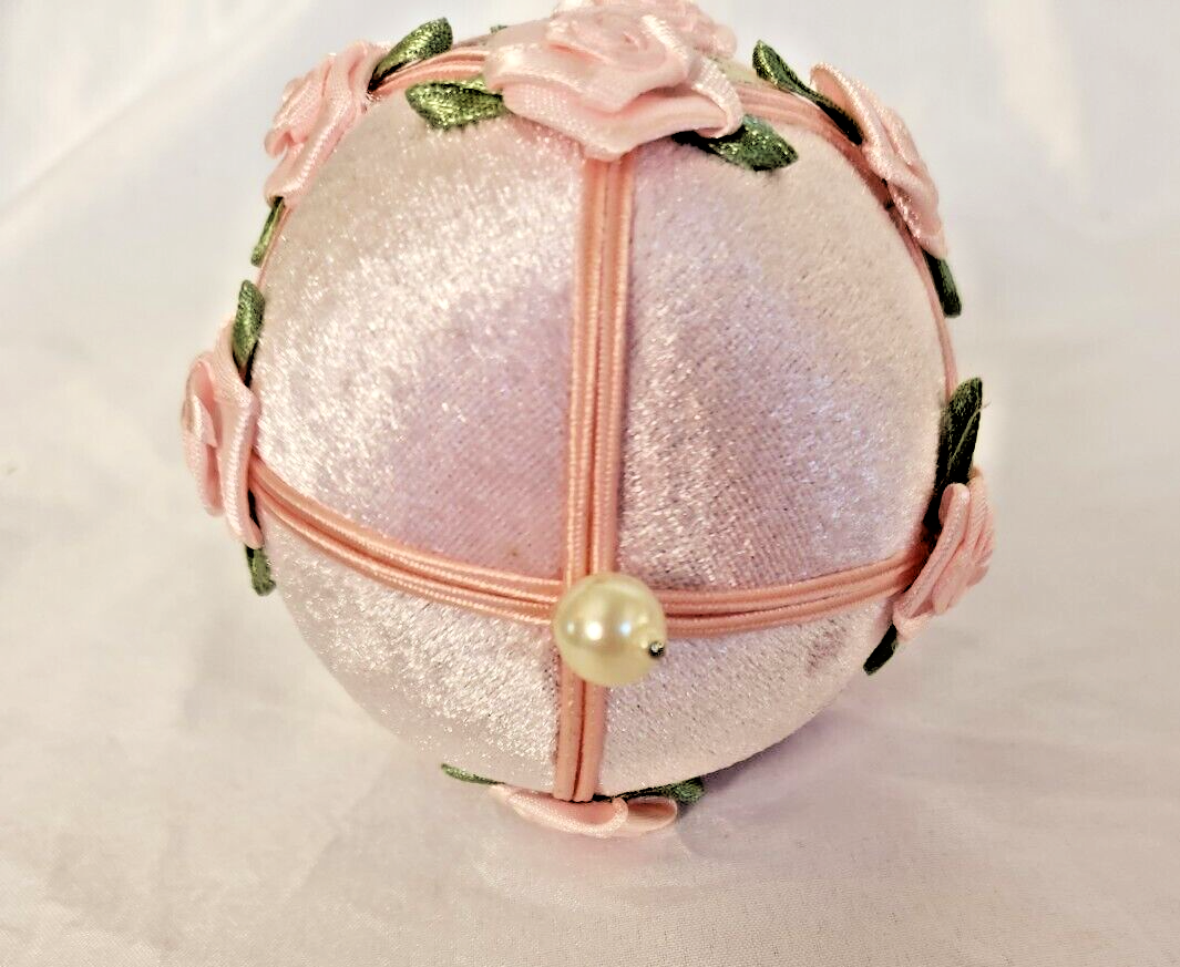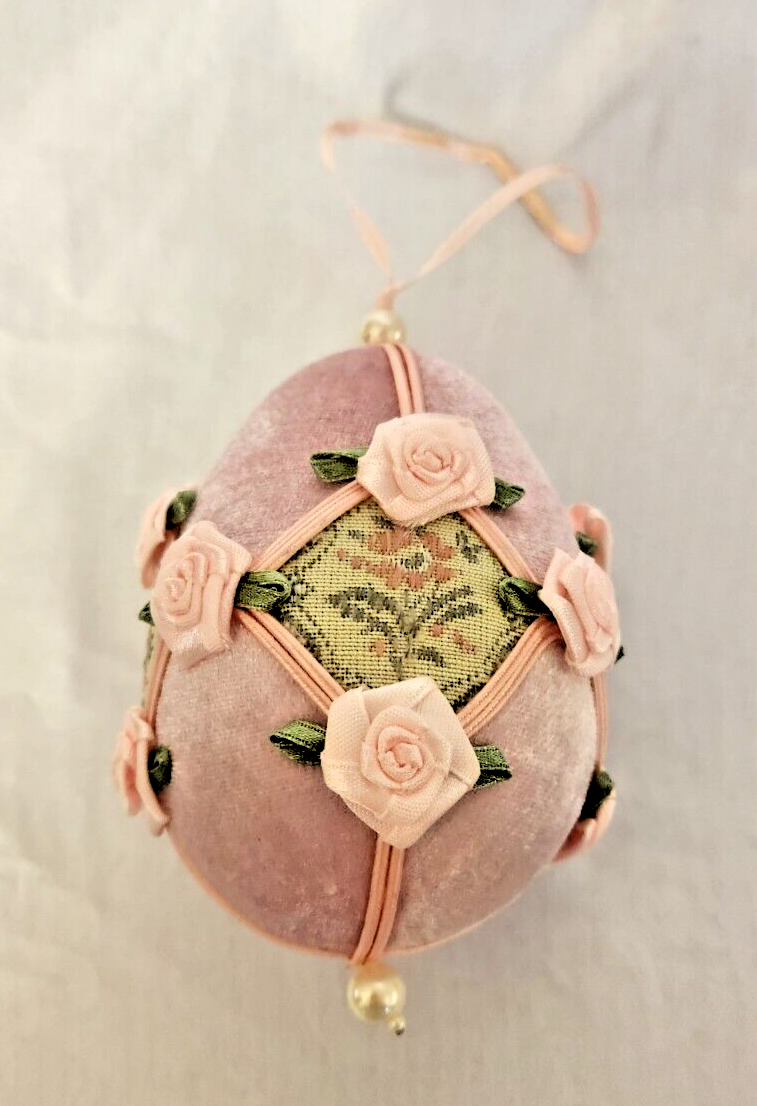 The Pink Velvet & Ribbon Victorian Style Egg Shaped Ornament is a decorative item ideal for Easter and spring occasions. This elegant ornament features a Victorian style design, made of velvet and fabric with pink color tones. The egg shape adds a festive touch, while the ribbon accents enhance its charm. Perfect for collectors or as a decorative piece during the holiday season.