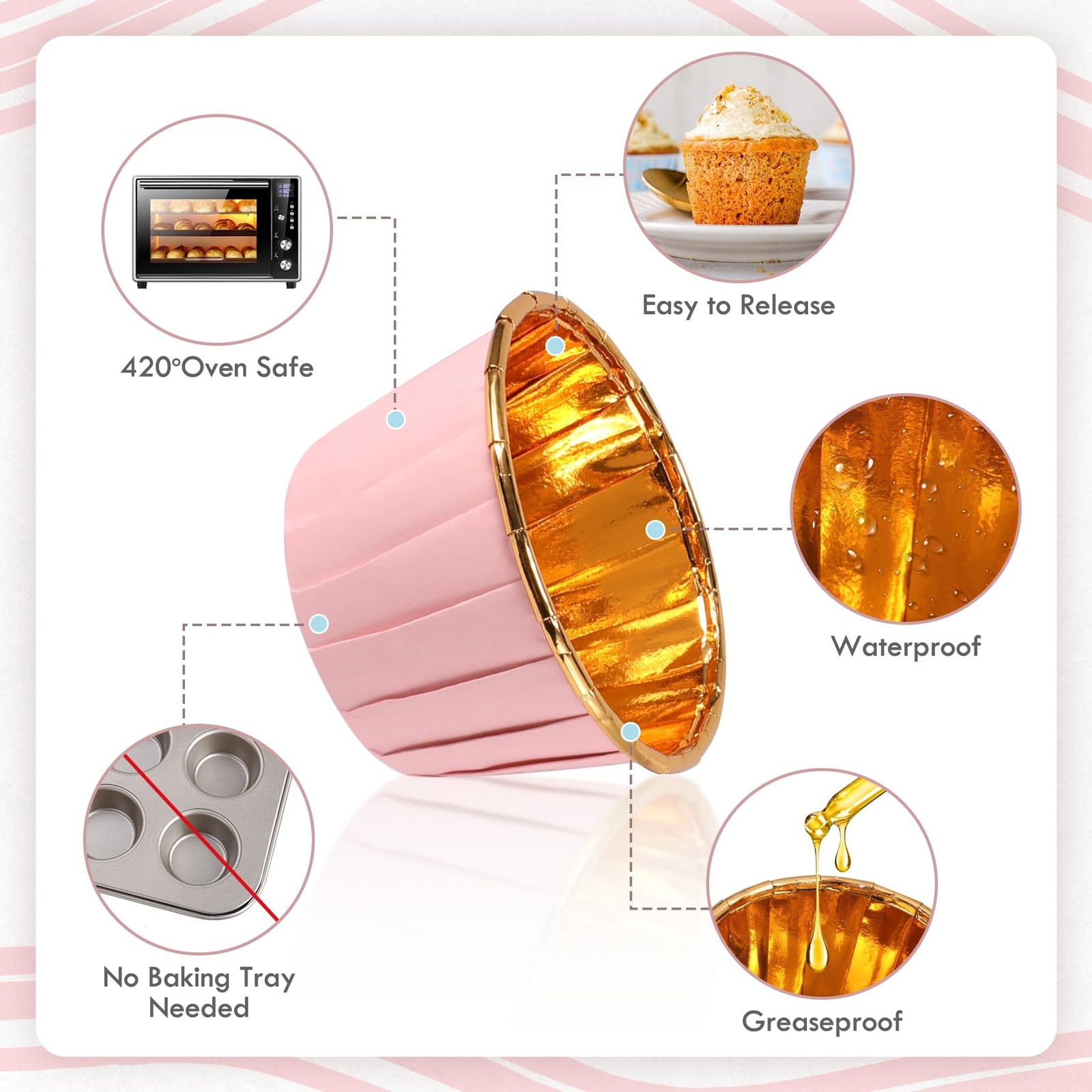 Pink and Gold Foil Cupcake Liners,100 pcs Disposable Muffin Liners 3.5 Oz Wrappers for Baking, Metallic Muffin Paper Cases Baking Cups Product Details Color: Pink and Gold Brand: TRUSBER MPN: 0060027 UPC: Does not apply EAN: Does not apply Color: Pink and Gold Brand: TRUSBER Material: Aluminum Capacity: 3.5 ounces Reusability: Disposable Color: Pink and Gold Brand: TRUSBER Material: Aluminum Capacity: 3.5 ounces Reusability: Disposable Occasion: Wedding, Baby Shower, Housewarming, Birthday, Valentine's Day Material Feature: Disposable Shape: Round Size: 2.7x1.5x2in Manufacturer: TRUSBER Number of Items: 100 Item Diameter: 2.68 Inches Item Weight: 6.7 ounces Country of Origin: China Item model number: 0060027 Date First Available: May 23, 2023 NO BAKING TRAY NEEDED - These Pink Cupcake Liners are made of premium quality food grade aluminum foil that makes these strong and sturdy, also keeping bright colors when in the oven. Just put them into the oven and bake them directly HEAT RESISTANCE - TRUSBER Baking Cups are oven safe and can withstand temperatures of up to 220C/425F and the longest baking time is 20 minutes. Anti-stick and oil-proof, flavorless, clean and environment-friendly, and disposable. It also separates easily from the cakes. (But Microwave Not Available) APPROPRIATE SIZE - The Foil Muffin Liners measure approximately 2.75 x 1.5 x 2 inches, and the capacity is about 3.5 ounces. Simply pull up the top rim ring, tear the cups, and remove your delicious cakes without any damage PERFECT FOR ANY OCCASION - These aluminum foil cupcake liners are perfect for indoor and outdoor use, such as picnics, camping, and other events. They're also great for family celebrations like birthdays, weddings, baby showers, and holidays like Easter, Thanksgiving, Christmas, Halloween, and Valentine's Day. Ideal for restaurants, bakeries, and chefs too ASSORTED SET - There are 100 pieces Foil Cupcake Cups in total. Meet your daily use and replacement needs, and you can also share them with your family and friends. If there is anything wrong with our products, please contact us as soon as possible