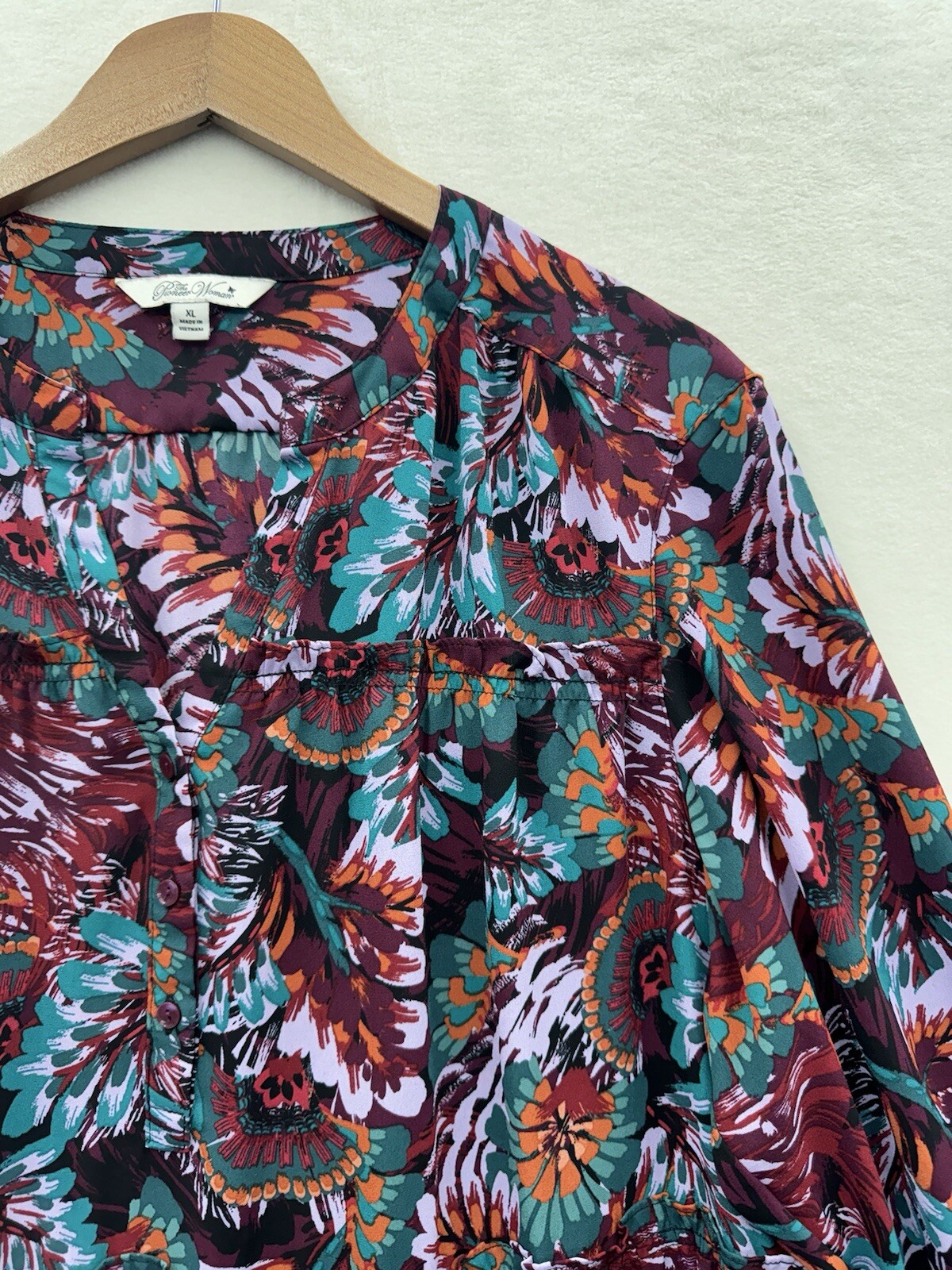 The Pioneer Woman XL Floral Tunic Blouse is a stylish and versatile addition to any woman's wardrobe. Featuring a beautiful floral pattern with ruffle accents, this blouse has a relaxed fit and long sleeves, making it perfect for various occasions including casual outings, workwear, and even business meetings. The high-low hem and V-neck neckline add a touch of sophistication, while the pullover closure and lightweight polyester material ensure easy care and comfort. With its colorful design and bohemian theme, this blouse is sure to become a go-to piece for all seasons.