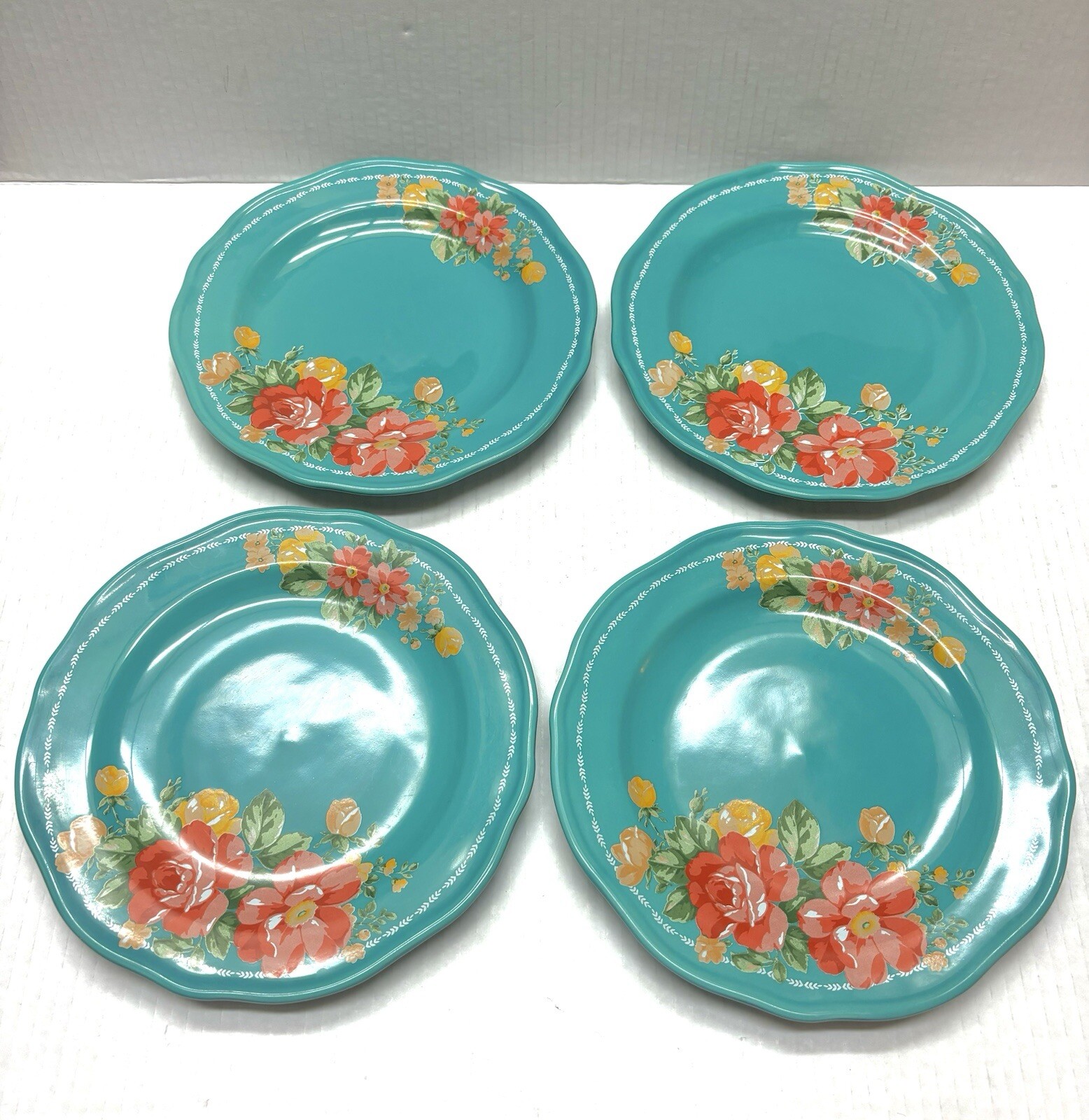 Add a touch of classic elegance to your dining table with this set of four Pioneer Woman salad plates. The floral pattern on teal adds a pop of color and the scalloped edges give the plates a charming cottage country design. The plates are made of durable stoneware and are both microwave and dishwasher safe for easy use and cleaning. The round shape and 8.5 inch diameter make them the perfect size for serving salads or any other dish. Impress your guests with these beautiful plates that are sure to become a staple in your kitchen.
