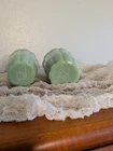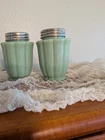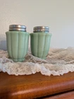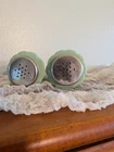 Pioneer Woman Timeless Beauty Jade Jadeite Milk Glass Green Salt Pepper Shakers. These shakers look like they have been used very little. There are some very tiny surface cracks that can't be felt. And hardly seen. It looks like they may be in the glaze. They just add to the vintage affect. Otherwise so chips. The lids may need a little polishing! There are no rust spots or dings. This particular set of Pioneer woman dishes was marketed when new as unique in the way that there are slight shade variations in the color. You can see this displayed very well in this pair of shakers!