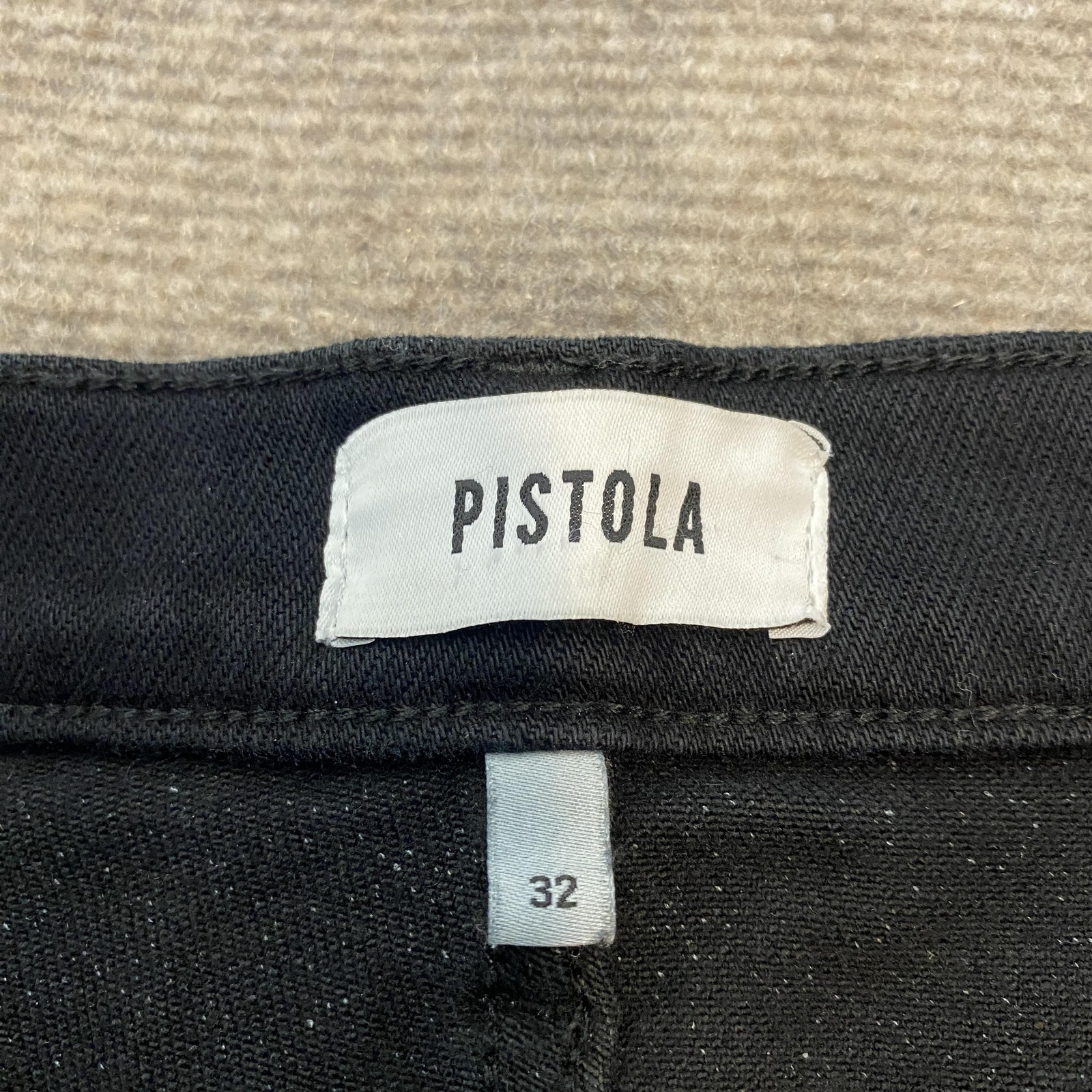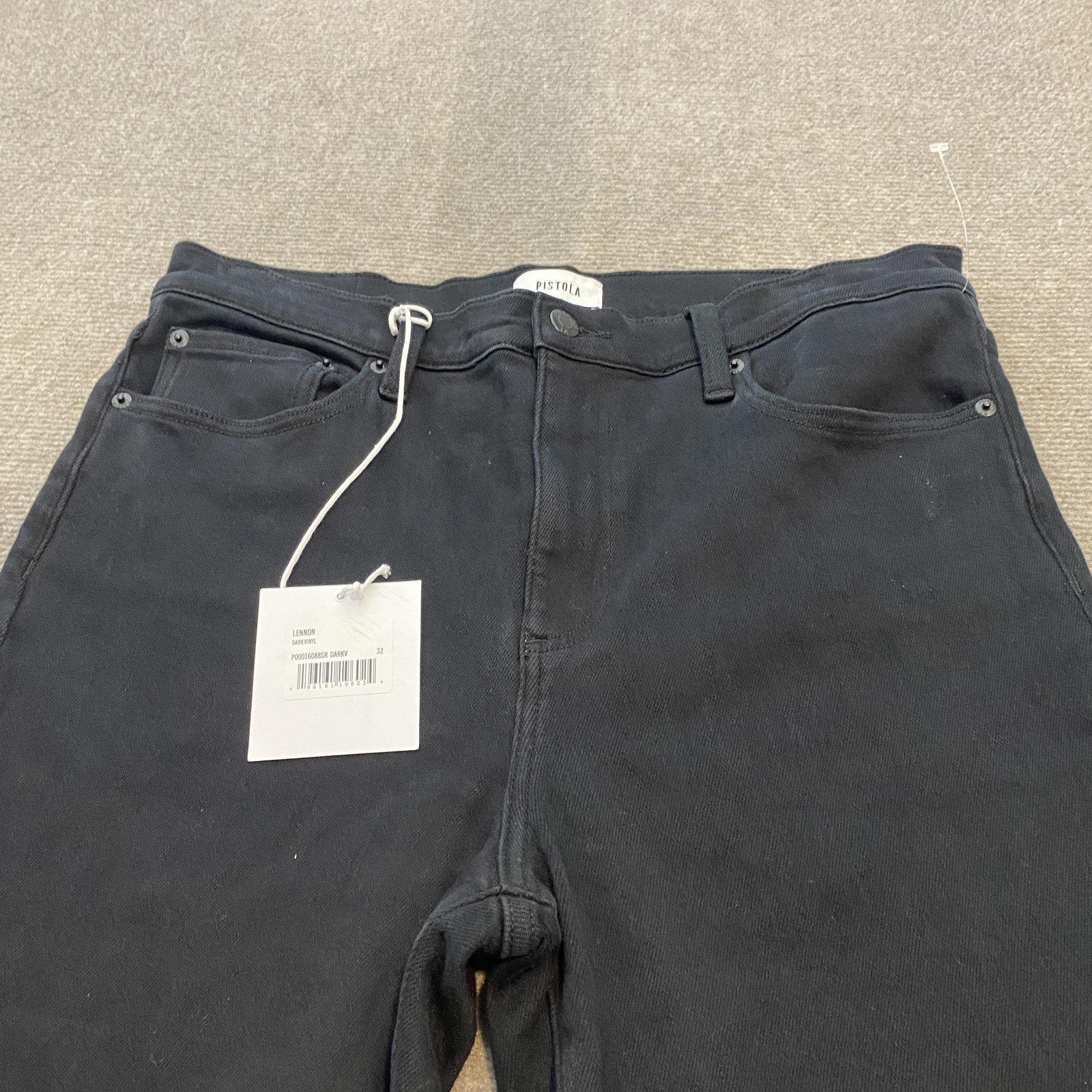 Brand: Pistola Style: Lennon high rise crop boot womens jeans with a bootcut leg opening and cropped length. Color: Dark black wash. Size on tag: 32. Materials: 95% cotton, 4% elasterell-P, 1% spandex (per interior tag). Style/Model code: P00016088SR DARKV. Details: Five-pocket design, zip fly with button closure, belt loops, stitched back pockets, Pistola logo patch at back waist, paper Pistola back-pocket tag reading "Lennon High Rise Crop Boot" and hang tag attached at front.
