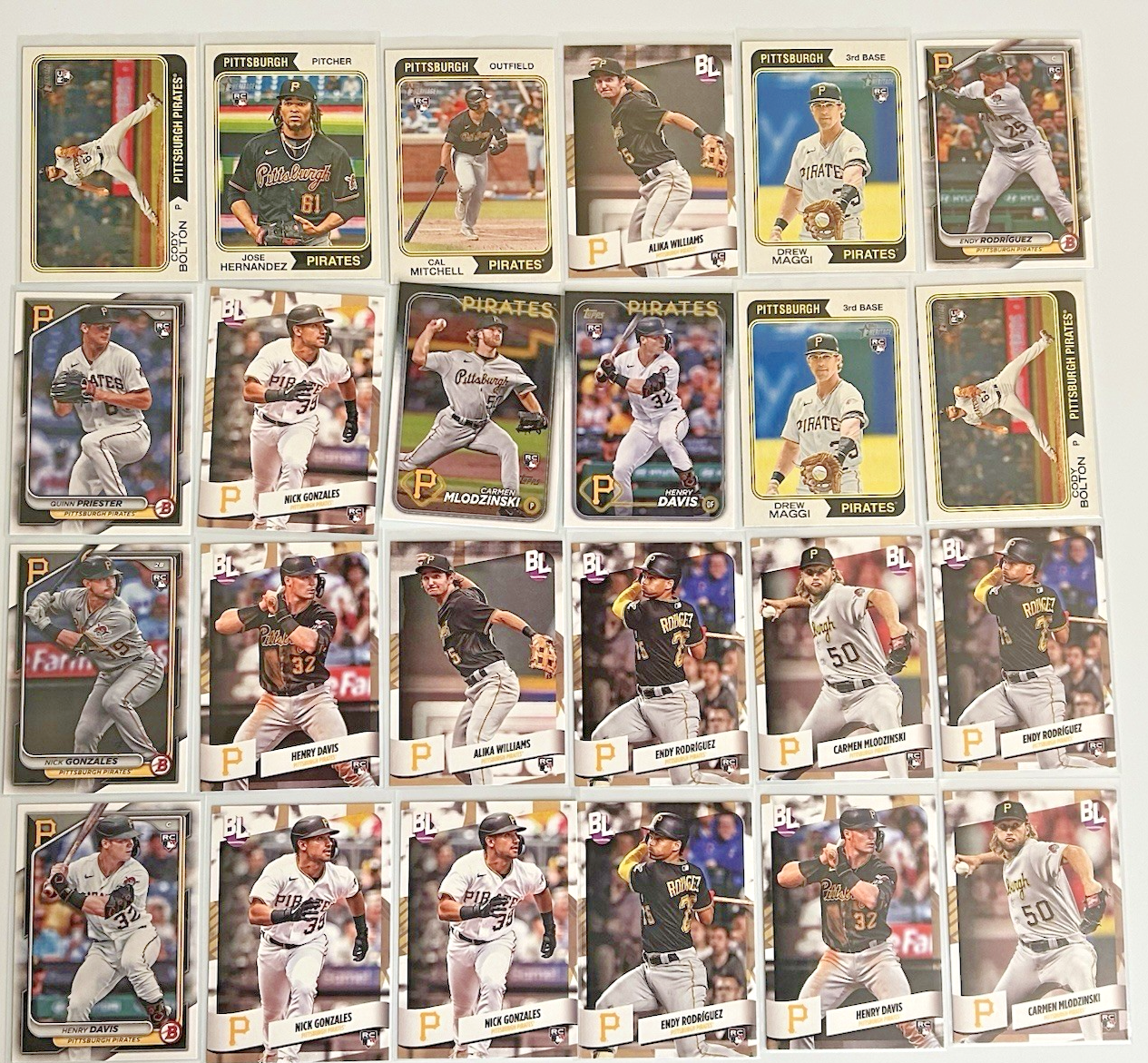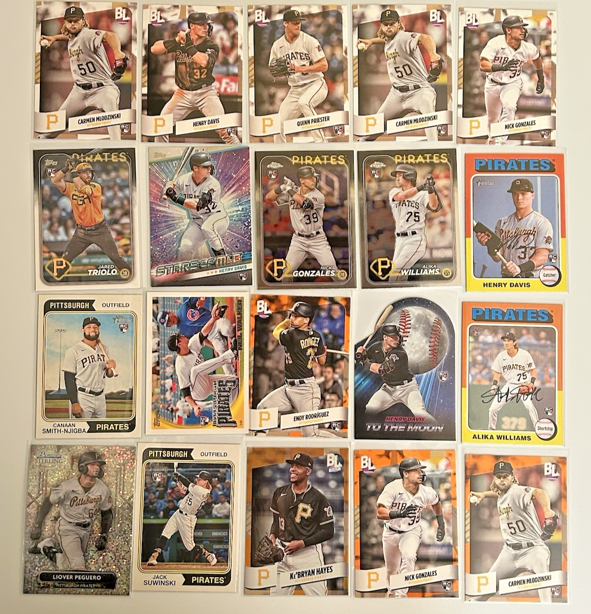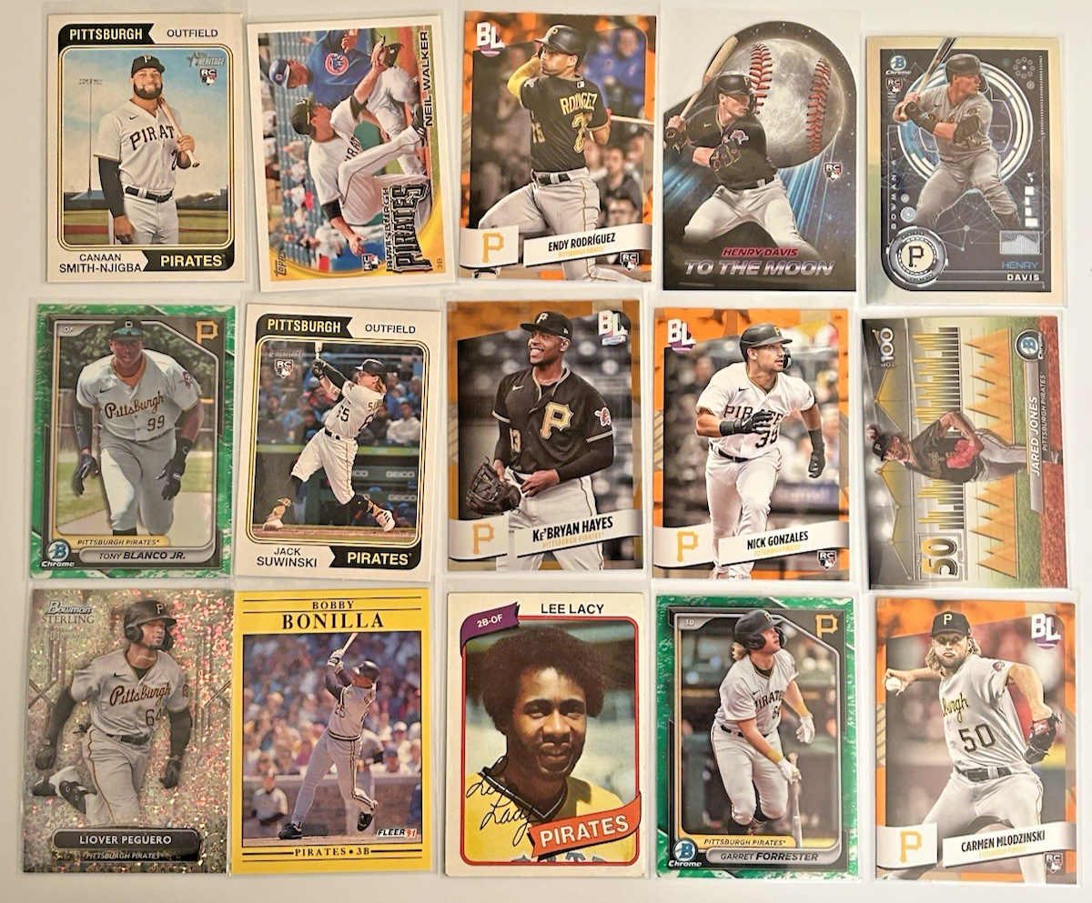 The Pittsburgh Pirates 135 Card Lot features a variety of inserts, parallels, and rookie cards from the Major League Baseball team. With a vintage feel and a focus on players like Andrew McCutchen, Ke'Bryan Hayes, and Bryan Reynolds, this collection is perfect for baseball card enthusiasts and fans of the Pittsburgh Pirates. The cards are standard size and manufactured by Topps, with a mix of English language text and various features including serial numbers, rookie designations, and parallel versions. This unique lot offers a diverse selection of baseball cards for collectors to enjoy.