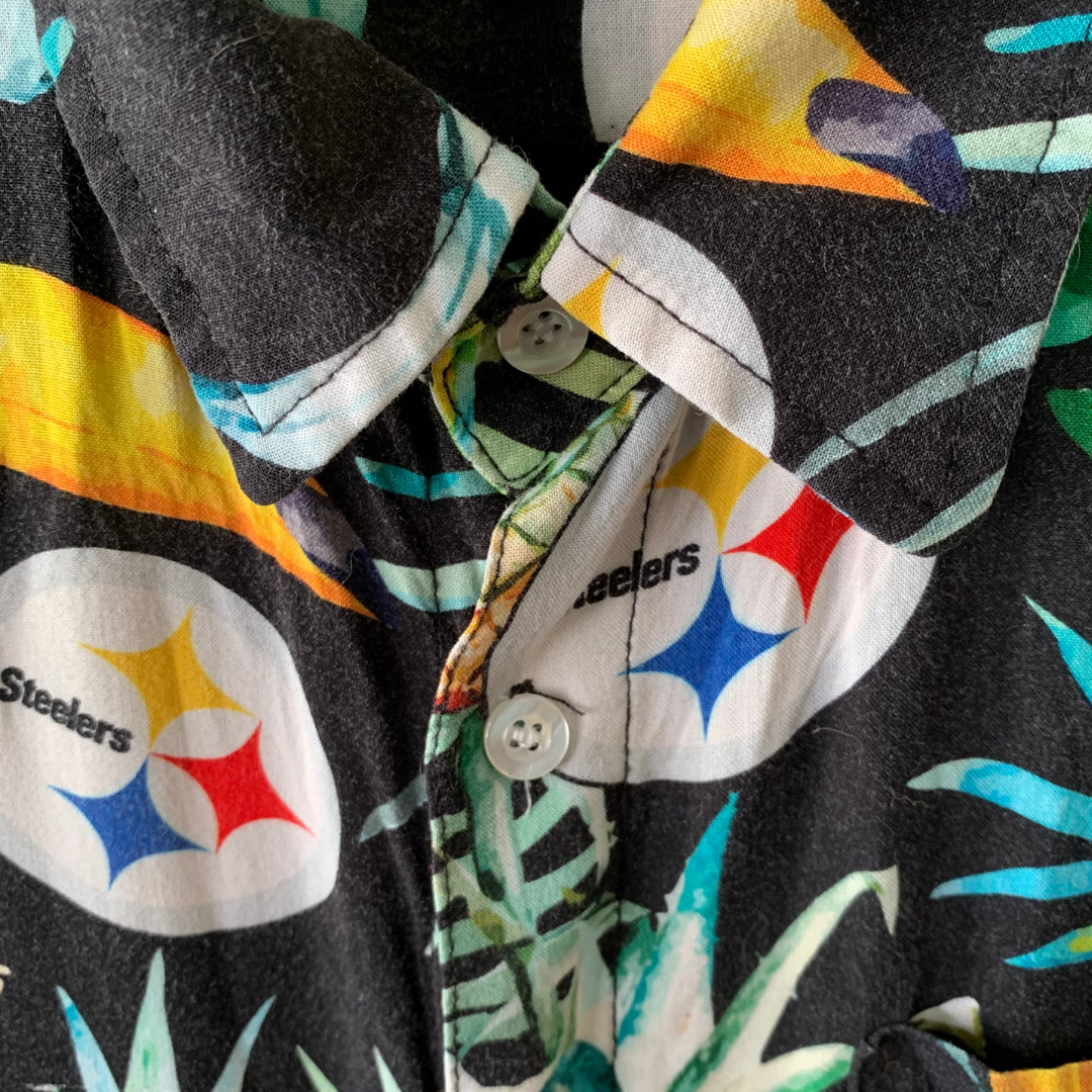 🏈 Pittsburgh Steelers Men’s M Hawaiian Tropical Button-Up Shirt NFL Parrots Pineapples Condition: Pre-owned, good condition. Normal wear consistent with age/use. Clean and ready to wear. Measurements (approx): Pit to Pit: 21 inches Length: 28.5 inches Details: Official Pittsburgh Steelers NFL-themed Hawaiian shirt Tropical design with parrots, pineapples, and team branding Short sleeve, button-up style — perfect for game day, tailgating, or casual summer wear Tagged M — see measurements for best fit Ships FAST! 💲 Price: $25.00