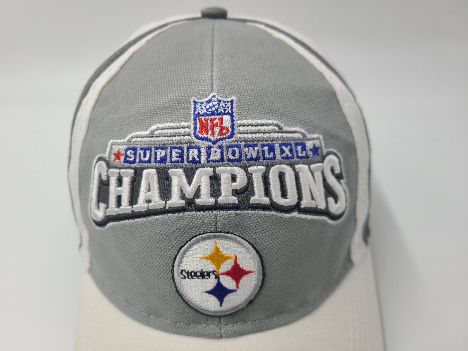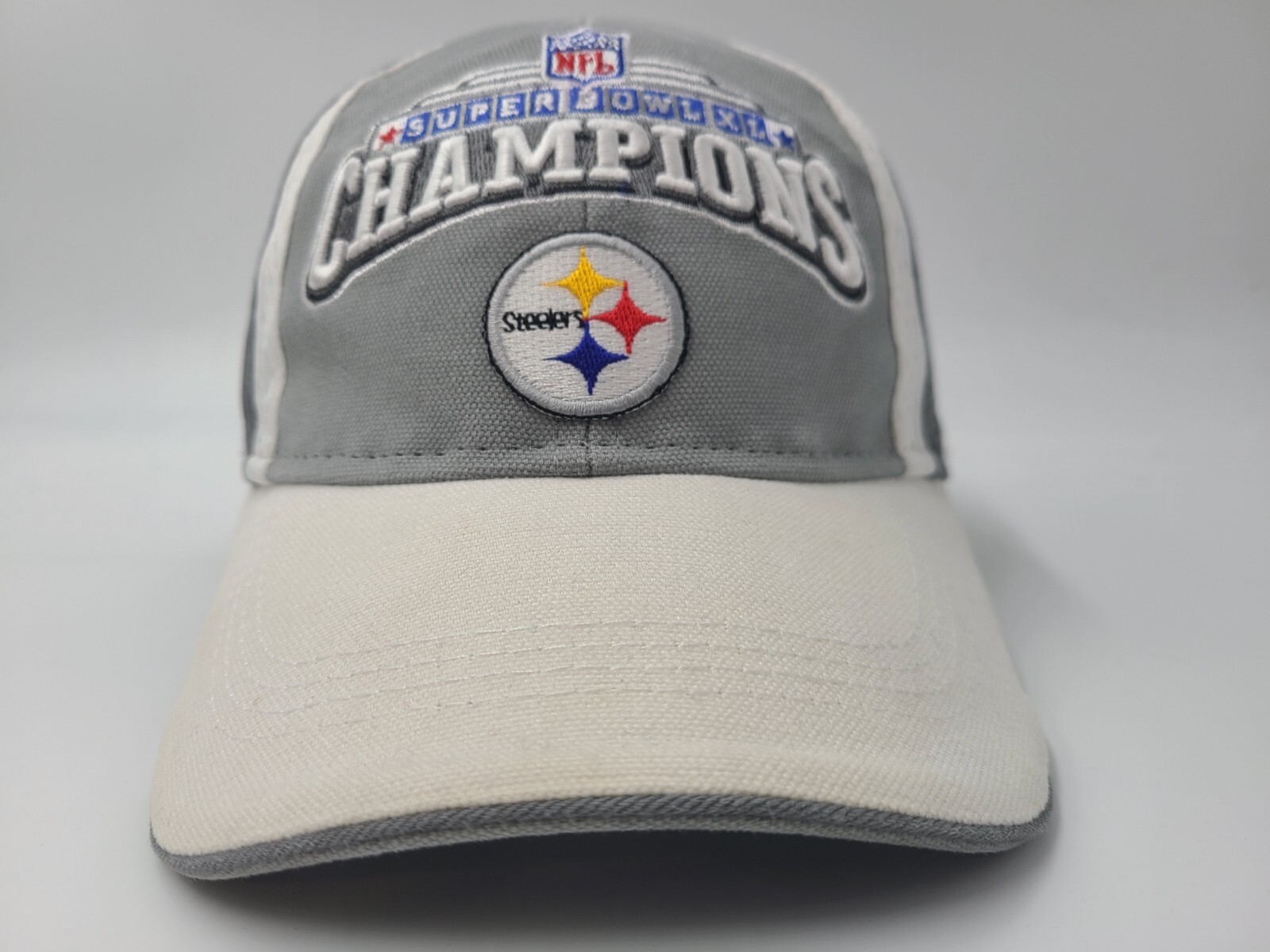 Has stains/discoloration on the brim, side, and back as seen in photos. Pittsburgh Steelers Super Bowl XL Champions Reebok Adjustable Hat Cap NFL Gray. EACH ADDITIONAL HAT PURCHASED IS ONLY $1 ADDED SHIPPING!