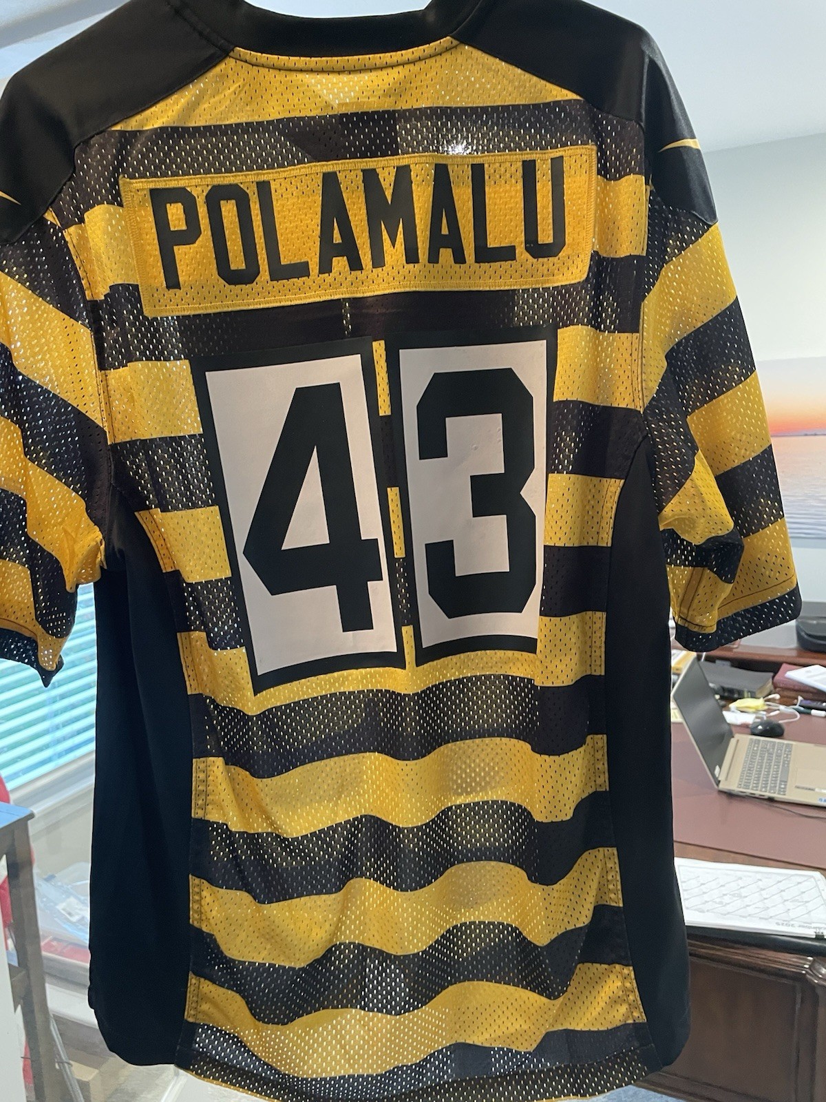 The product is a Pittsburgh Steelers Troy Polamalu #43 football jersey by Nike. It is a throwback style jersey with a short sleeve design, perfect for football fans looking to show their support for the team. The jersey comes in size L and is made for regular sizing, making it suitable for most adult fans to wear while cheering on the Steelers during games or casual wear. Made of high-quality materials, this jersey is a must-have for any die-hard Pittsburgh Steelers fan.